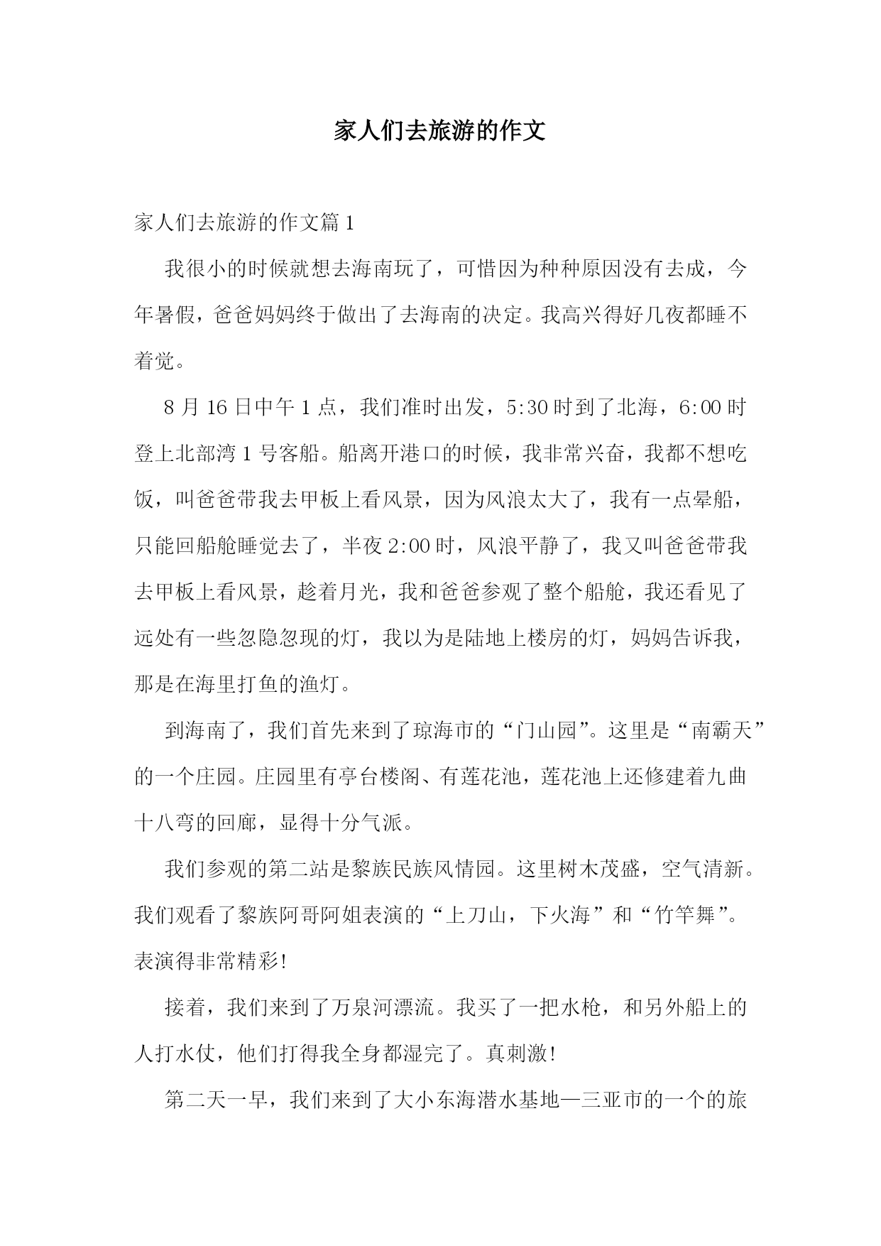 家人们去旅游的作文家人们去旅游的作文篇1我很小的时候就想去海南玩了,可惜因为种种原因没有去成,今年暑假,爸爸妈妈终于做出了去海南的决定。我高兴得好几夜都睡不着觉。8月16日中午1点,我们准时出发,5:30时到了北海,6:00时登上北部湾1号客船。船离开港口的时候,我非常兴奋,我都不想吃饭,叫爸爸带我去甲板上看风景,因为风浪太大了,我有一点晕船,只能回船舱睡觉去了,半夜2:00时,风浪平静了,我又叫爸爸带我去甲板上看风景,趁着月光,我和爸爸参观了整个船舱,我还看见了远处有一些忽隐忽现的灯,我以为是陆地上楼房