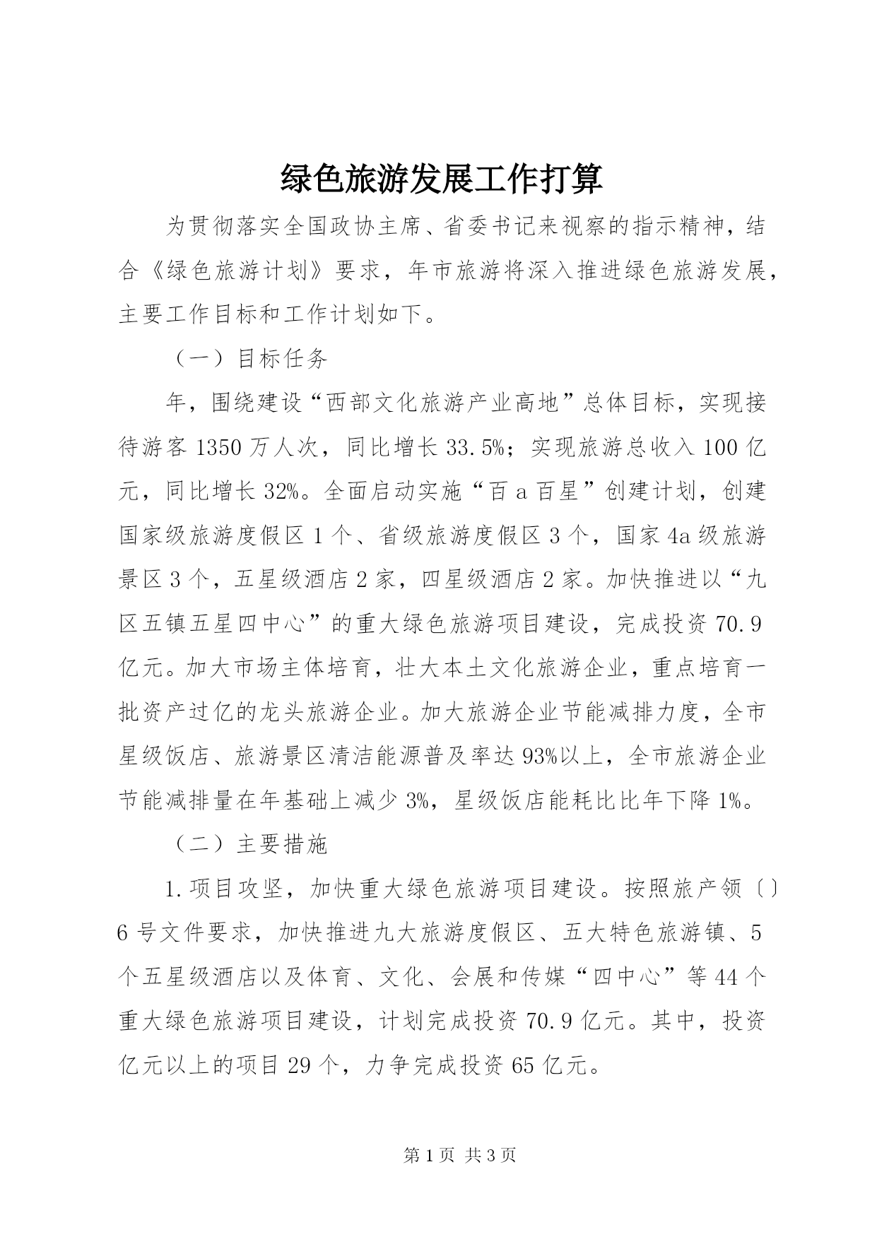第PAGE\*Arabic\*MERGEFORMAT3页共NUMPAGES\*MERGEFORMAT3页绿色旅游发展工作打算为贯彻落实全国政协主席、省委书记来视察的指示精神,结合《绿色旅游计划》要求,年市旅游将深入推进绿色旅游发展,主要工作目标和工作计划如下。(一)目标任务年,围绕建设“西部文化旅游产业高地”总体目标,实现接待游客1350万人次,同比增长33.5%;实现旅游总收入100亿元,同比增长32%。全面启动实施“百a百星”创建计划,创建国家级旅游度假区1个、省级旅游度假区3个,国家4a