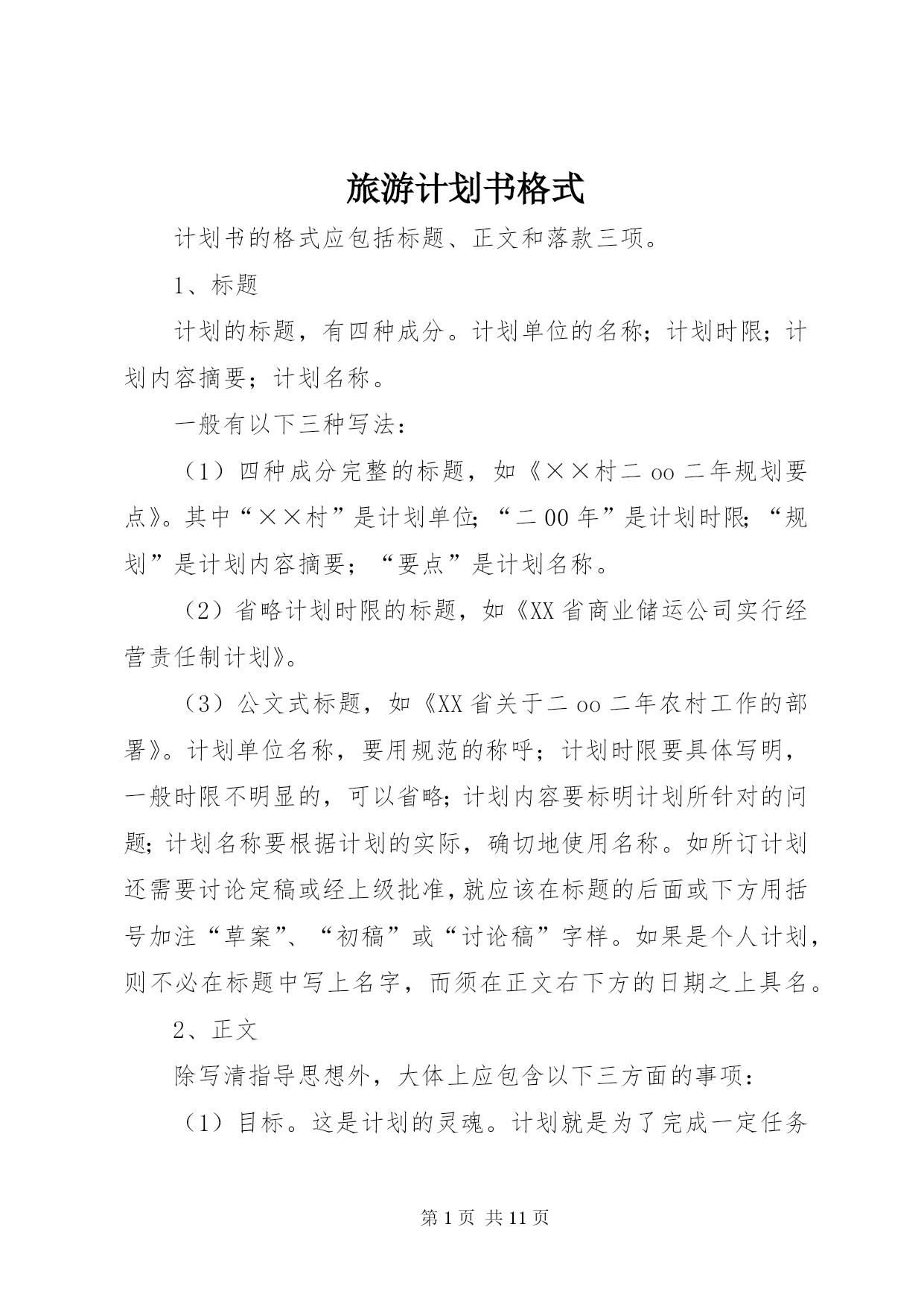 第PAGE\*Arabic\*MERGEFORMAT11页共NUMPAGES\*MERGEFORMAT11页旅游计划书格式计划书的格式应包括标题、正文和落款三项。1、标题计划的标题,有四种成分。计划单位的名称;计划时限;计划内容摘要;计划名称。一般有以下三种写法:(1)四种成分完整的标题,如《××村二oo二年规划要点》。其中“××村”是计划单位;“二00年”是计划时限;“规划”是计划内容摘要;“要点”是计划名称。(2)省略计划时限的标题,如《XX省商业储运公司实行经营责任制计划》。(3)公文式