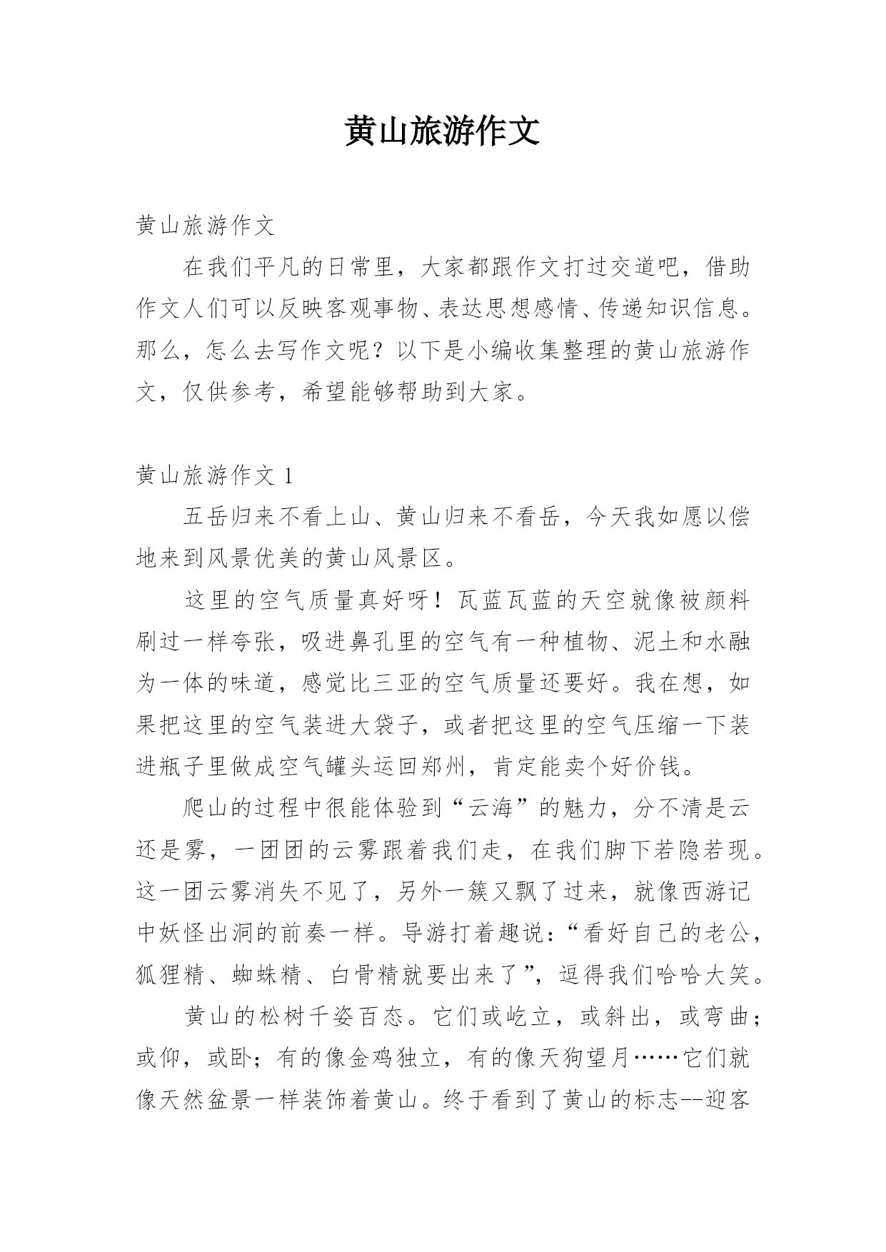 黄山旅游的作文关于黄山旅游的作文在生活、工作和学习中,大家都经常接触到作文吧,作文一定要做到主题集中,围绕同一主题作深入阐述,切忌东拉西扯,主题涣散甚至无主题。如何写一篇有思想、有文采的作文呢?下面是小编为大家整理的关于黄山旅游的作文,仅供参考,欢迎大家阅读。关于黄山旅游的作文1在二年级语文课本里,我们学过了《黄山奇石》,我看着课文里赞美黄山奇石的句子,真想哪一天去黄山看看。今天我的愿望终于实现了,我非常开心。我们的车子快到黄山脚下的时候,导游问我们:“你们知道这里为什么叫"黄山"吗?”我们都说是黄色的山