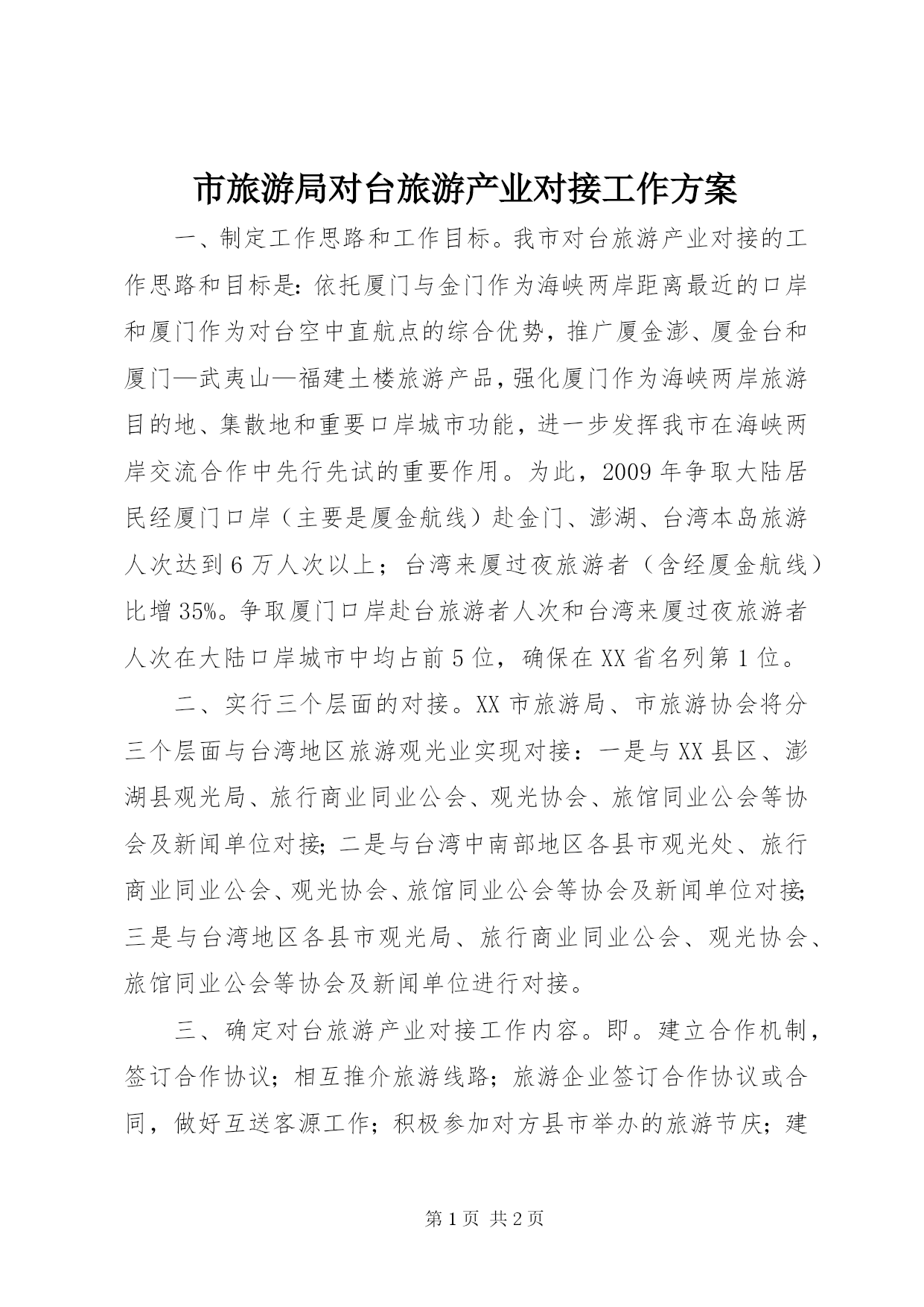 第PAGE\*Arabic\*MERGEFORMAT2页共NUMPAGES\*MERGEFORMAT2页市旅游局对台旅游产业对接工作方案一、制定工作思路和工作目标。我市对台旅游产业对接的工作思路和目标是:依托厦门与金门作为海峡两岸距离最近的口岸和厦门作为对台空中直航点的综合优势,推广厦金澎、厦金台和厦门—武夷山—福建土楼旅游产品,强化厦门作为海峡两岸旅游目的地、集散地和重要口岸城市功能,进一步发挥我市在海峡两岸交流合作中先行先试的重要作用。为此,2009年争取大陆居民经厦门口岸(主要是厦金航线
