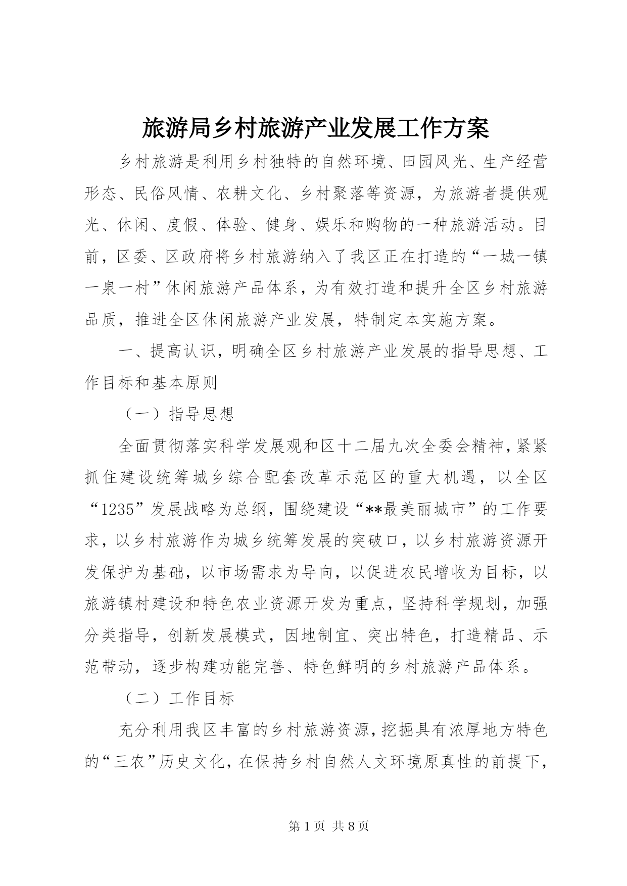 第PAGE\*Arabic\*MERGEFORMAT8页共NUMPAGES\*MERGEFORMAT8页旅游局乡村旅游产业发展工作方案乡村旅游是利用乡村独特的自然环境、田园风光、生产经营形态、民俗风情、农耕文化、乡村聚落等资源,为旅游者提供观光、休闲、度假、体验、健身、娱乐和购物的一种旅游活动。目前,区委、区政府将乡村旅游纳入了我区正在打造的“一城一镇一泉一村”休闲旅游产品体系,为有效打造和提升全区乡村旅游品质,推进全区休闲旅游产业发展,特制定本实施方案。一、提高认识,明确全区乡村旅游产业发展