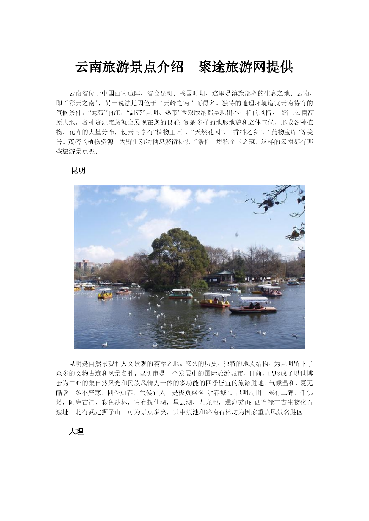 云南旅游景点介绍聚途旅游网提供云南省位于中国西南边陲,省会昆明。战国时期,这里是滇族部落的生息之地。云南,即“彩云之南”,另一说法是因位于“云岭之南”而得名。独特的地理环境造就云南特有的气候条件,“寒带”丽江、“温带”昆明、热带”西双版纳都呈现出不一样的风情。踏上云南高原大地,各种资源宝藏就会展现在您的眼前:复杂多样的地形地貌和立体气候,形成各种植物、花卉的大量分布,使云南享有“植物王国”、“天然花园”、“香料之乡”、“药物宝库”等美誉。茂密的植物资源,为野生动物栖息繁衍提供了条件,堪称全国之冠。这样的云