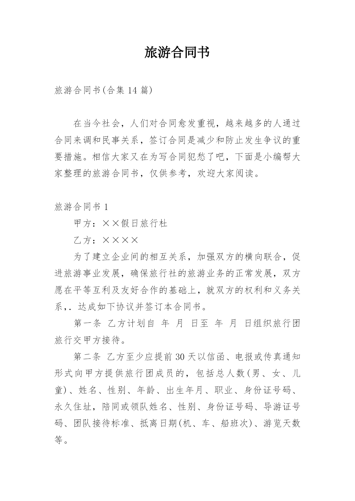 旅游合同书旅游合同书(合集14篇)在当今社会,人们对合同愈发重视,越来越多的人通过合同来调和民事关系,签订合同是减少和防止发生争议的重要措施。相信大家又在为写合同犯愁了吧,下面是小编帮大家整理的旅游合同书,仅供参考,欢迎大家阅读。旅游合同书1甲方:××假日旅行杜乙方:××××为了建立企业间的相互关系,加强双方的横向联合,促进旅游事业发展,确保旅行社的旅游业务的正常发展,双方愿在平等互利及友好合作的基础上,就双方的权利和义务关系,.达成如下协议并签订本合同书。第一条乙方计划自年月日至年月日组织旅行团旅行交甲