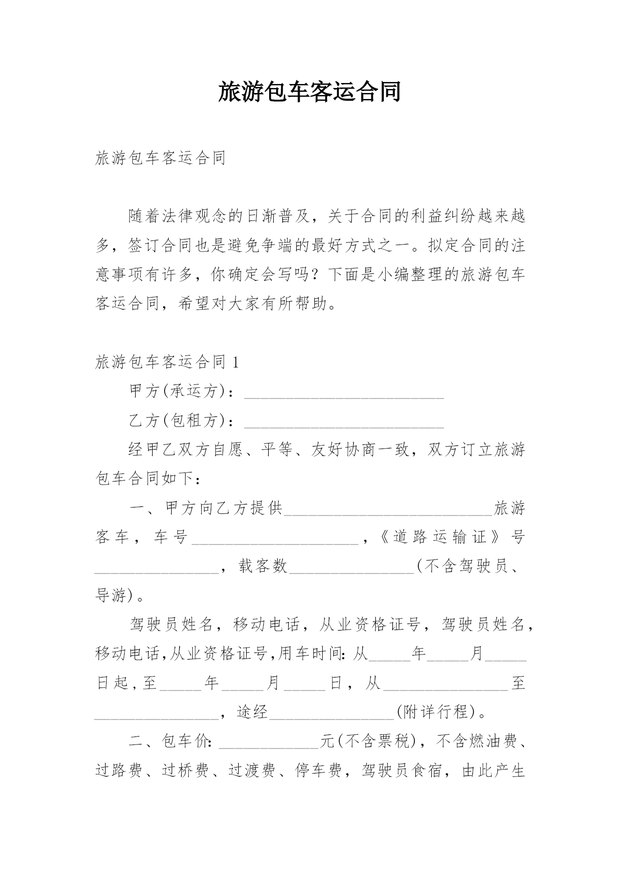 旅游包车客运合同旅游包车客运合同随着法律观念的日渐普及,关于合同的利益纠纷越来越多,签订合同也是避免争端的最好方式之一。拟定合同的注意事项有许多,你确定会写吗?下面是小编整理的旅游包车客运合同,希望对大家有所帮助。旅游包车客运合同1甲方(承运方):________________________乙方(包租方):________________________经甲乙双方自愿、平等、友好协商一致,双方订立旅游包车合同如下:一、甲方向乙方提供_________________________旅游客车,车号___