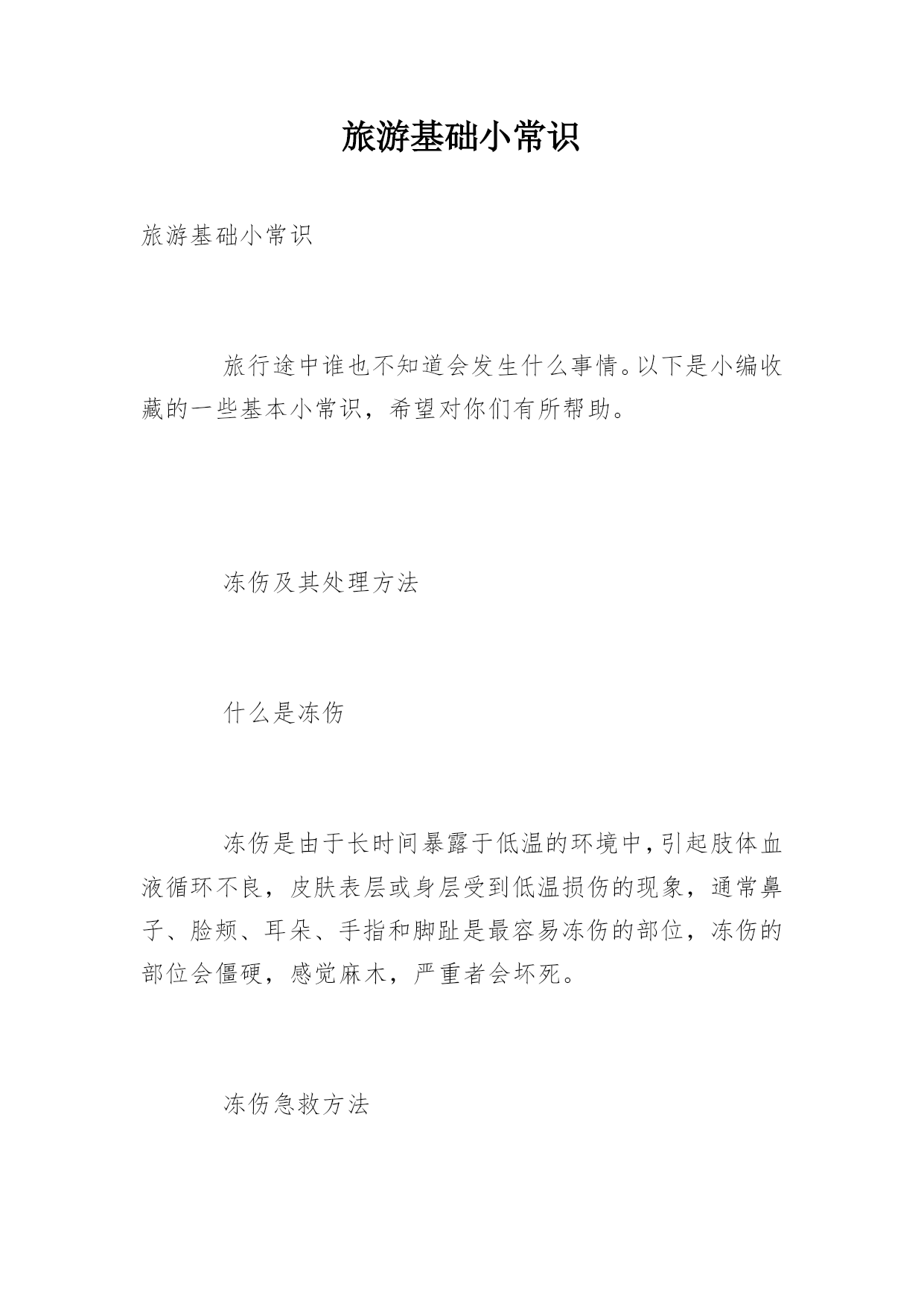 旅游基础小常识旅游基础小常识旅行途中谁也不知道会发生什么事情。以下是小编收藏的一些基本小常识,希望对你们有所帮助。冻伤及其处理方法什么是冻伤冻伤是由于长时间暴露于低温的环境中,引起肢体血液循环不良,皮肤表层或身层受到低温损伤的现象,通常鼻子、脸颊、耳朵、手指和脚趾是最容易冻伤的部位,冻伤的部位会僵硬,感觉麻木,严重者会坏死。冻伤急救方法将患者带至室内。缓缓供应热饮料。将冻伤部位浸入温水(38~40度)中(切勿用热水)。长时间无法送医时,伤处勿解冻。加盖衣物、毛毯以保温。切勿揉搓患部,以免引起坏死。尽速送医