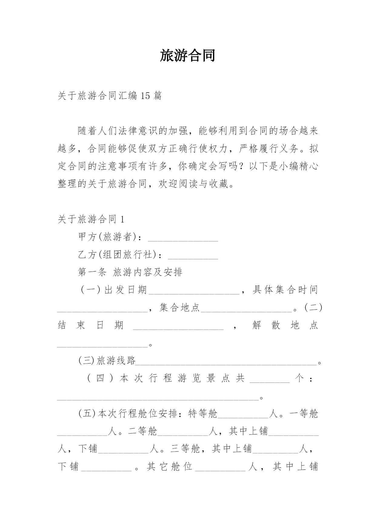 旅游合同关于旅游合同汇编15篇随着人们法律意识的加强,能够利用到合同的场合越来越多,合同能够促使双方正确行使权力,严格履行义务。拟定合同的注意事项有许多,你确定会写吗?以下是小编精心整理的关于旅游合同,欢迎阅读与收藏。关于旅游合同1甲方(旅游者):______________乙方(组团旅行社):__________第一条旅游内容及安排(一)出发日期__________________,具体集合时间__________________,集合地点__________________。(二)结束日期______