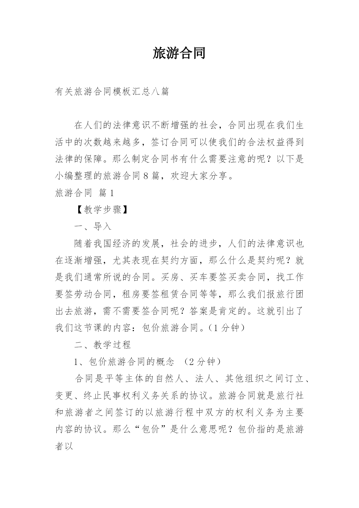 旅游合同有关旅游合同模板汇总八篇在人们的法律意识不断增强的社会,合同出现在我们生活中的次数越来越多,签订合同可以使我们的合法权益得到法律的保障。那么制定合同书有什么需要注意的呢?以下是小编整理的旅游合同8篇,欢迎大家分享。旅游合同篇1【教学步骤】一、导入随着我国经济的发展,社会的进步,人们的法律意识也在逐渐增强,尤其表现在契约方面,那么什么是契约呢?就是我们通常所说的合同。买房、买车要签买卖合同,找工作要签劳动合同,租房要签租赁合同等等,那么我们报旅行团出去旅游,需不需要签合同呢?答案是肯定的。这就引出了