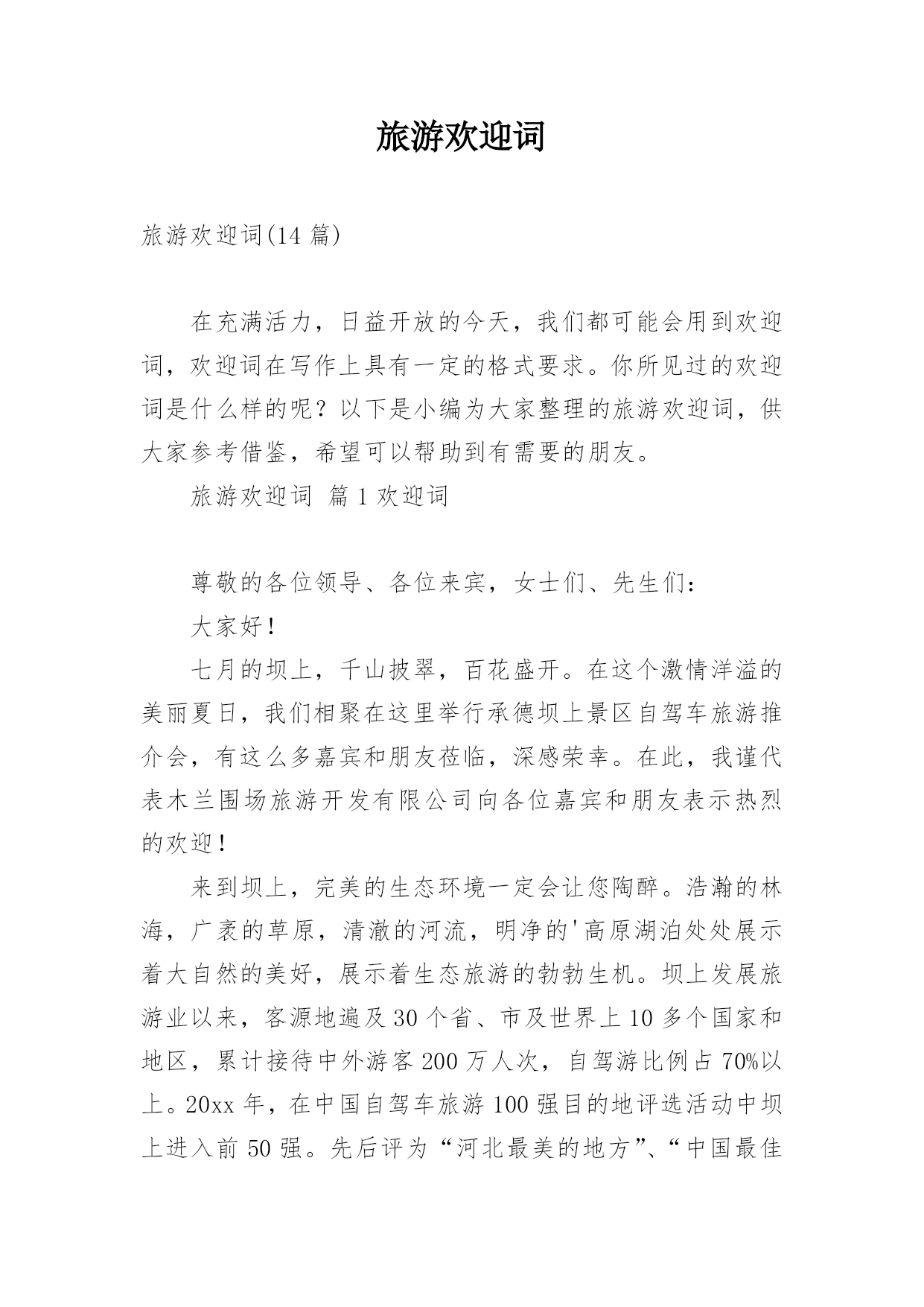 旅游欢迎词旅游欢迎词(14篇)在充满活力,日益开放的今天,我们都可能会用到欢迎词,欢迎词在写作上具有一定的格式要求。你所见过的欢迎词是什么样的呢?以下是小编为大家整理的旅游欢迎词,供大家参考借鉴,希望可以帮助到有需要的朋友。旅游欢迎词篇1欢迎词尊敬的各位领导、各位来宾,女士们、先生们:大家好!七月的坝上,千山披翠,百花盛开。在这个激情洋溢的美丽夏日,我们相聚在这里举行承德坝上景区自驾车旅游推介会,有这么多嘉宾和朋友莅临,深感荣幸。在此,我谨代表木兰围场旅游开发有限公司向各位嘉宾和朋友表示热烈的欢迎!来到坝