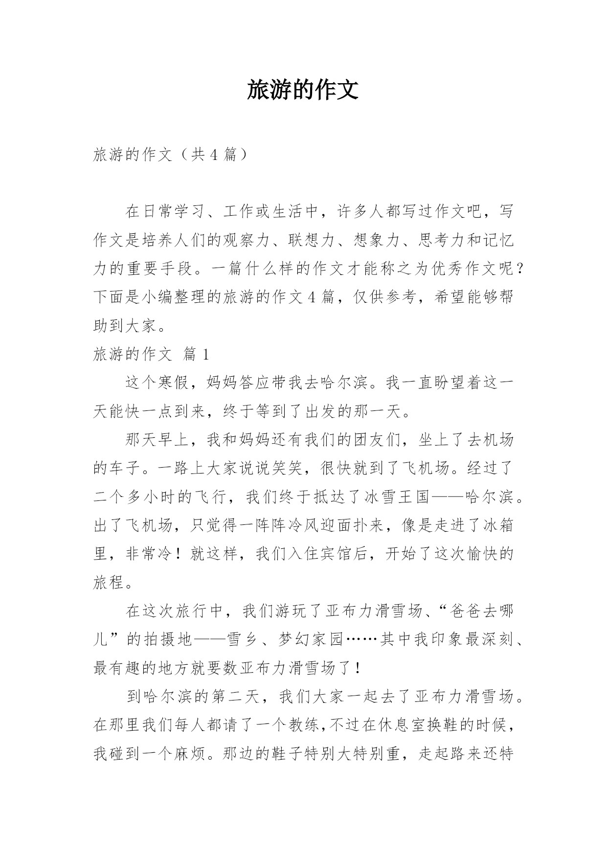 旅游的作文旅游的作文(共4篇)在日常学习、工作或生活中,许多人都写过作文吧,写作文是培养人们的观察力、联想力、想象力、思考力和记忆力的重要手段。一篇什么样的作文才能称之为优秀作文呢?下面是小编整理的旅游的作文4篇,仅供参考,希望能够帮助到大家。旅游的作文篇1这个寒假,妈妈答应带我去哈尔滨。我一直盼望着这一天能快一点到来,终于等到了出发的那一天。那天早上,我和妈妈还有我们的团友们,坐上了去机场的车子。一路上大家说说笑笑,很快就到了飞机场。经过了二个多小时的飞行,我们终于抵达了冰雪王国——哈尔滨。出了飞机场,