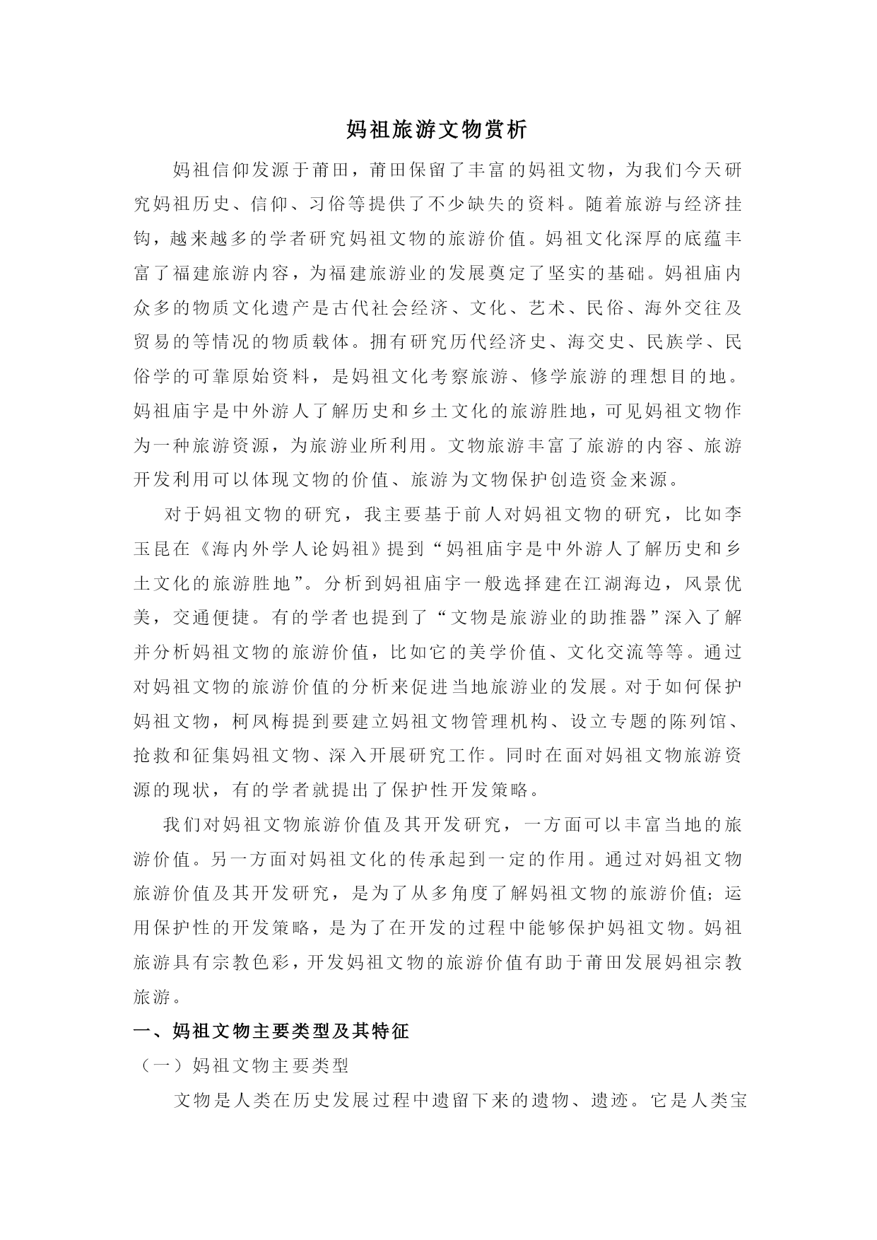 妈祖旅游文物赏析妈祖信仰发源于莆田,莆田保留了丰富的妈祖文物,为我们今天研究妈祖历史、信仰、习俗等提供了不少缺失的资料。随着旅游与HYPERLINK"http://www.homelunwen.com/a/jingjilunwen/"\t"_blank"经济挂钩,越来越多的学者研究妈祖文物的旅游价值。妈祖文化深厚的底蕴丰富了福建旅游内容,为福建旅游业的发展奠定了坚实的基础。妈祖庙内众多的物质文化遗产是古代社会HYPERLINK"http://www.homelunwen.com/a/jingjil