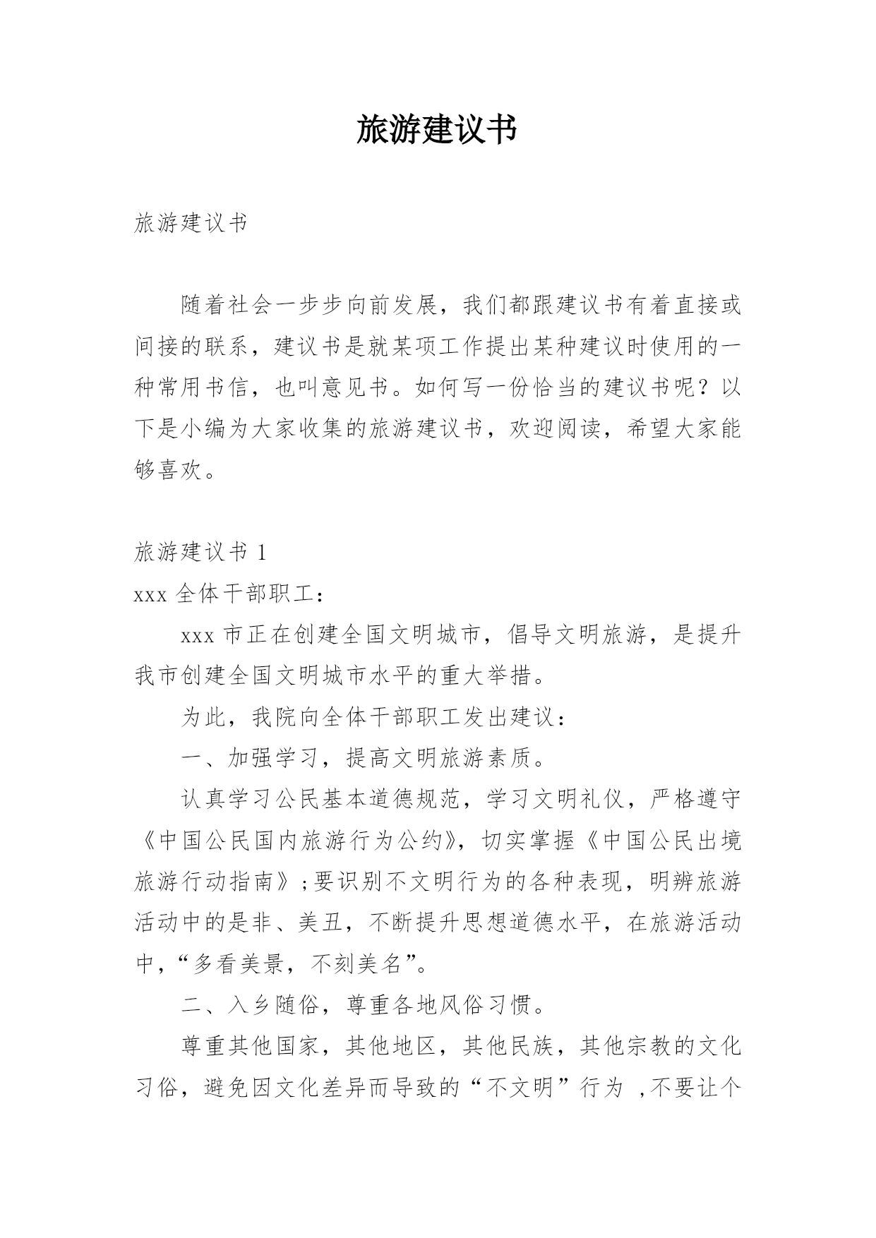 旅游建议书旅游建议书随着社会一步步向前发展,我们都跟建议书有着直接或间接的联系,建议书是就某项工作提出某种建议时使用的一种常用书信,也叫意见书。如何写一份恰当的建议书呢?以下是小编为大家收集的旅游建议书,欢迎阅读,希望大家能够喜欢。旅游建议书1xxx全体干部职工:xxx市正在创建全国文明城市,倡导文明旅游,是提升我市创建全国文明城市水平的重大举措。为此,我院向全体干部职工发出建议:一、加强学习,提高文明旅游素质。认真学习公民基本道德规范,学习文明礼仪,严格遵守《中国公民国内旅游行为公约》,切实掌握《中国公