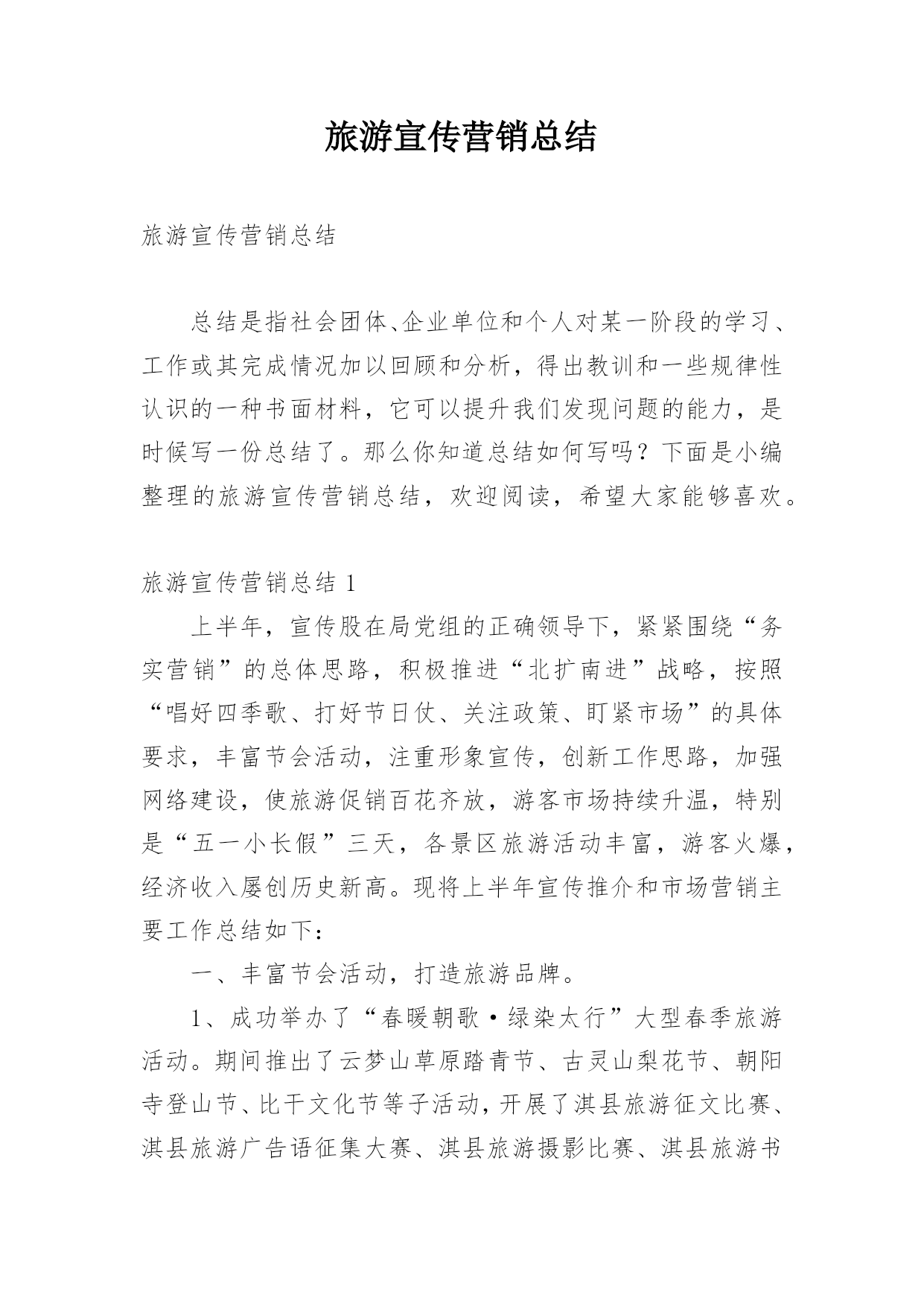 旅游宣传营销总结旅游宣传营销总结总结是指社会团体、企业单位和个人对某一阶段的学习、工作或其完成情况加以回顾和分析,得出教训和一些规律性认识的一种书面材料,它可以提升我们发现问题的能力,是时候写一份总结了。那么你知道总结如何写吗?下面是小编整理的旅游宣传营销总结,欢迎阅读,希望大家能够喜欢。旅游宣传营销总结1上半年,宣传股在局党组的正确领导下,紧紧围绕“务实营销”的总体思路,积极推进“北扩南进”战略,按照“唱好四季歌、打好节日仗、关注政策、盯紧市场”的具体要求,丰富节会活动,注重形象宣传,创新工作思路,加强