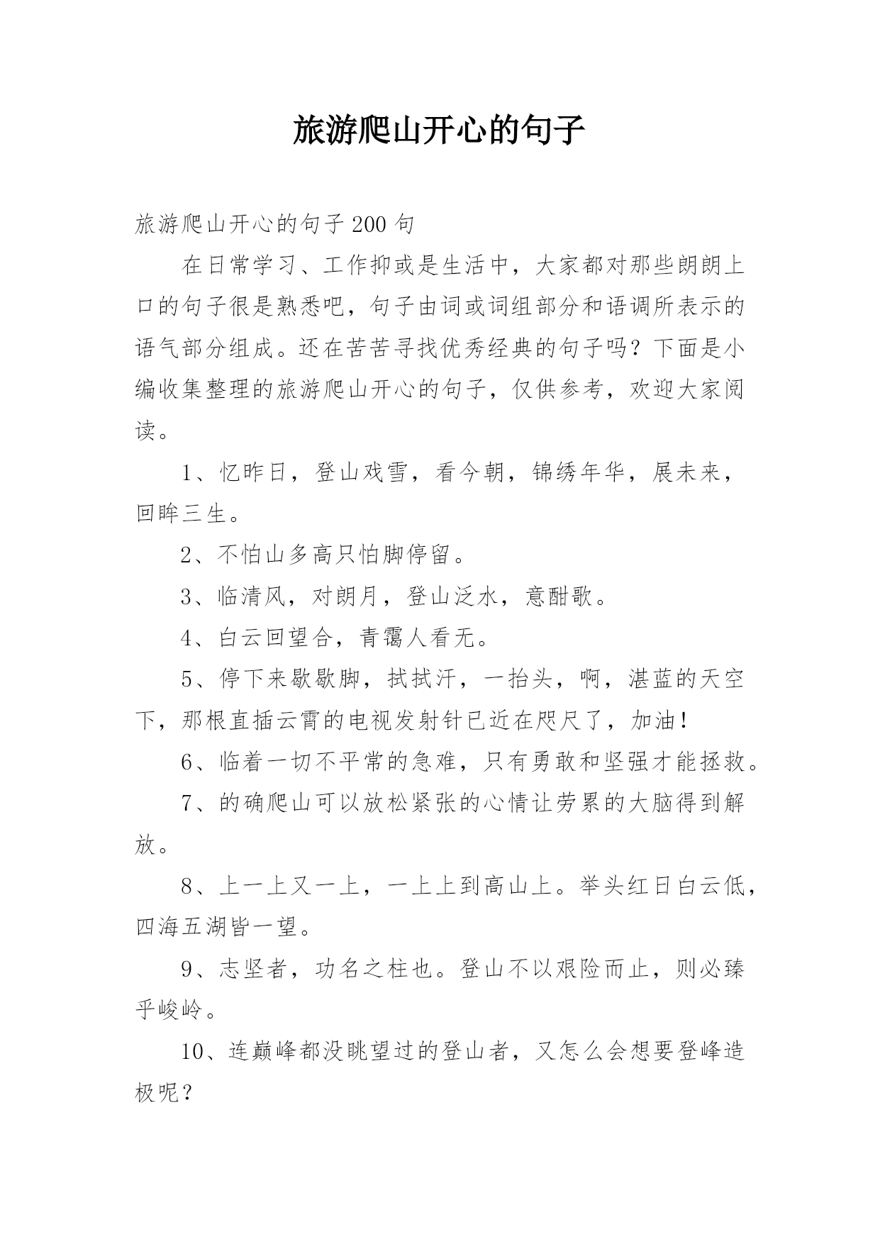旅游爬山开心的句子旅游爬山开心的句子200句在日常学习、工作抑或是生活中,大家都对那些朗朗上口的句子很是熟悉吧,句子由词或词组部分和语调所表示的语气部分组成。还在苦苦寻找优秀经典的句子吗?下面是小编收集整理的旅游爬山开心的句子,仅供参考,欢迎大家阅读。1、忆昨日,登山戏雪,看今朝,锦绣年华,展未来,回眸三生。2、不怕山多高只怕脚停留。3、临清风,对朗月,登山泛水,意酣歌。4、白云回望合,青霭人看无。5、停下来歇歇脚,拭拭汗,一抬头,啊,湛蓝的天空下,那根直插云霄的电视发射针已近在咫尺了,加油!6、临着一切