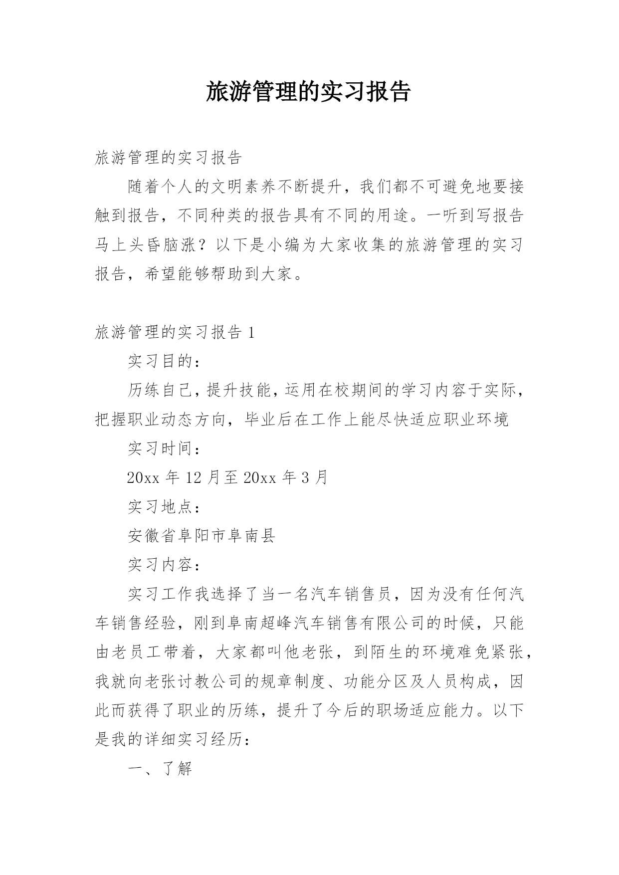 旅游管理的实习报告旅游管理的实习报告随着个人的文明素养不断提升,我们都不可避免地要接触到报告,不同种类的报告具有不同的用途。一听到写报告马上头昏脑涨?以下是小编为大家收集的旅游管理的实习报告,希望能够帮助到大家。旅游管理的实习报告1实习目的:历练自己,提升技能,运用在校期间的学习内容于实际,把握职业动态方向,毕业后在工作上能尽快适应职业环境实习时间:20xx年12月至20xx年3月实习地点:安徽省阜阳市阜南县实习内容:实习工作我选择了当一名汽车销售员,因为没有任何汽车销售经验,刚到阜南超峰汽车销售有限公司