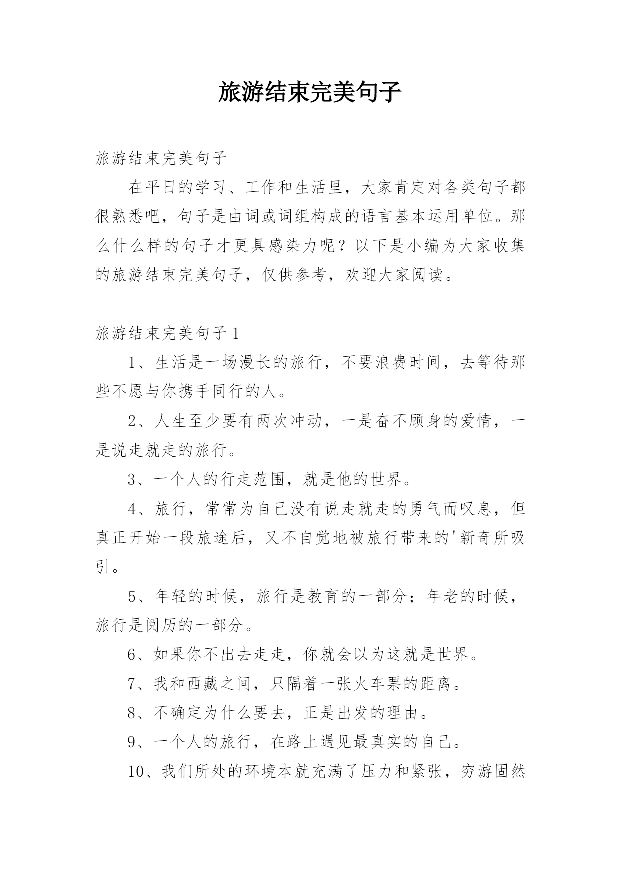 旅游结束完美句子旅游结束完美句子在平日的学习、工作和生活里,大家肯定对各类句子都很熟悉吧,句子是由词或词组构成的语言基本运用单位。那么什么样的句子才更具感染力呢?以下是小编为大家收集的旅游结束完美句子,仅供参考,欢迎大家阅读。旅游结束完美句子11、生活是一场漫长的旅行,不要浪费时间,去等待那些不愿与你携手同行的人。2、人生至少要有两次冲动,一是奋不顾身的爱情,一是说走就走的旅行。3、一个人的行走范围,就是他的世界。4、旅行,常常为自己没有说走就走的勇气而叹息,但真正开始一段旅途后,又不自觉地被旅行带来的'