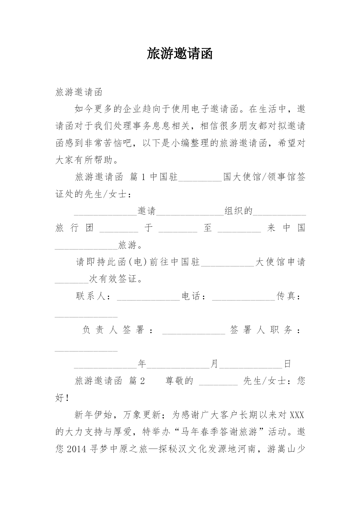 旅游邀请函旅游邀请函如今更多的企业趋向于使用电子邀请函。在生活中,邀请函对于我们处理事务息息相关,相信很多朋友都对拟邀请函感到非常苦恼吧,以下是小编整理的旅游邀请函,希望对大家有所帮助。旅游邀请函篇1中国驻_________国大使馆/领事馆签证处的先生/女士:_____________邀请______________组织的___________旅行团________于________至_________来中国_____________旅游。请即持此函(电)前往中国驻___________大使馆申请____