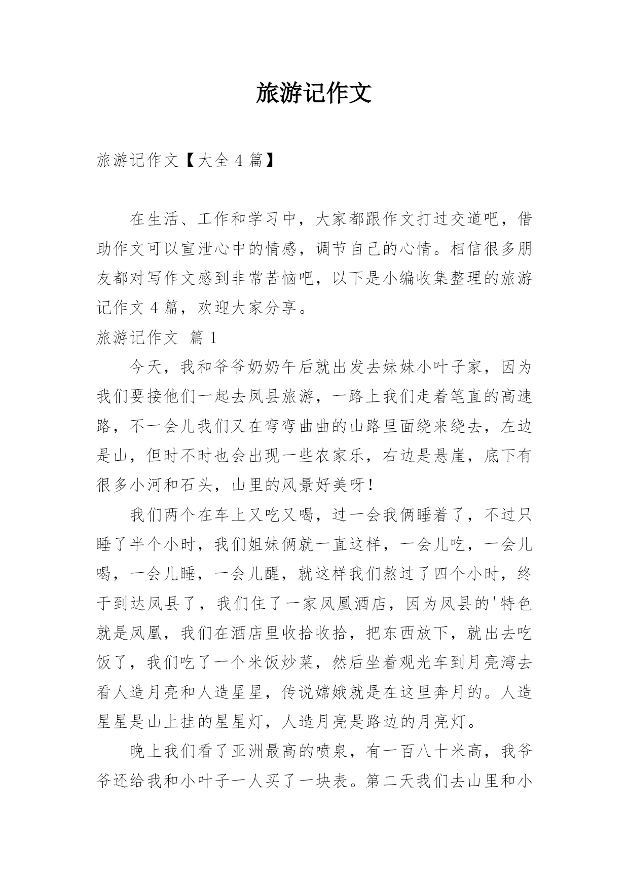 旅游记作文旅游记作文【大全4篇】在生活、工作和学习中,大家都跟作文打过交道吧,借助作文可以宣泄心中的情感,调节自己的心情。相信很多朋友都对写作文感到非常苦恼吧,以下是小编收集整理的旅游记作文4篇,欢迎大家分享。旅游记作文篇1今天,我和爷爷奶奶午后就出发去妹妹小叶子家,因为我们要接他们一起去凤县旅游,一路上我们走着笔直的高速路,不一会儿我们又在弯弯曲曲的山路里面绕来绕去,左边是山,但时不时也会出现一些农家乐,右边是悬崖,底下有很多小河和石头,山里的风景好美呀!我们两个在车上又吃又喝,过一会我俩睡着了,不过只