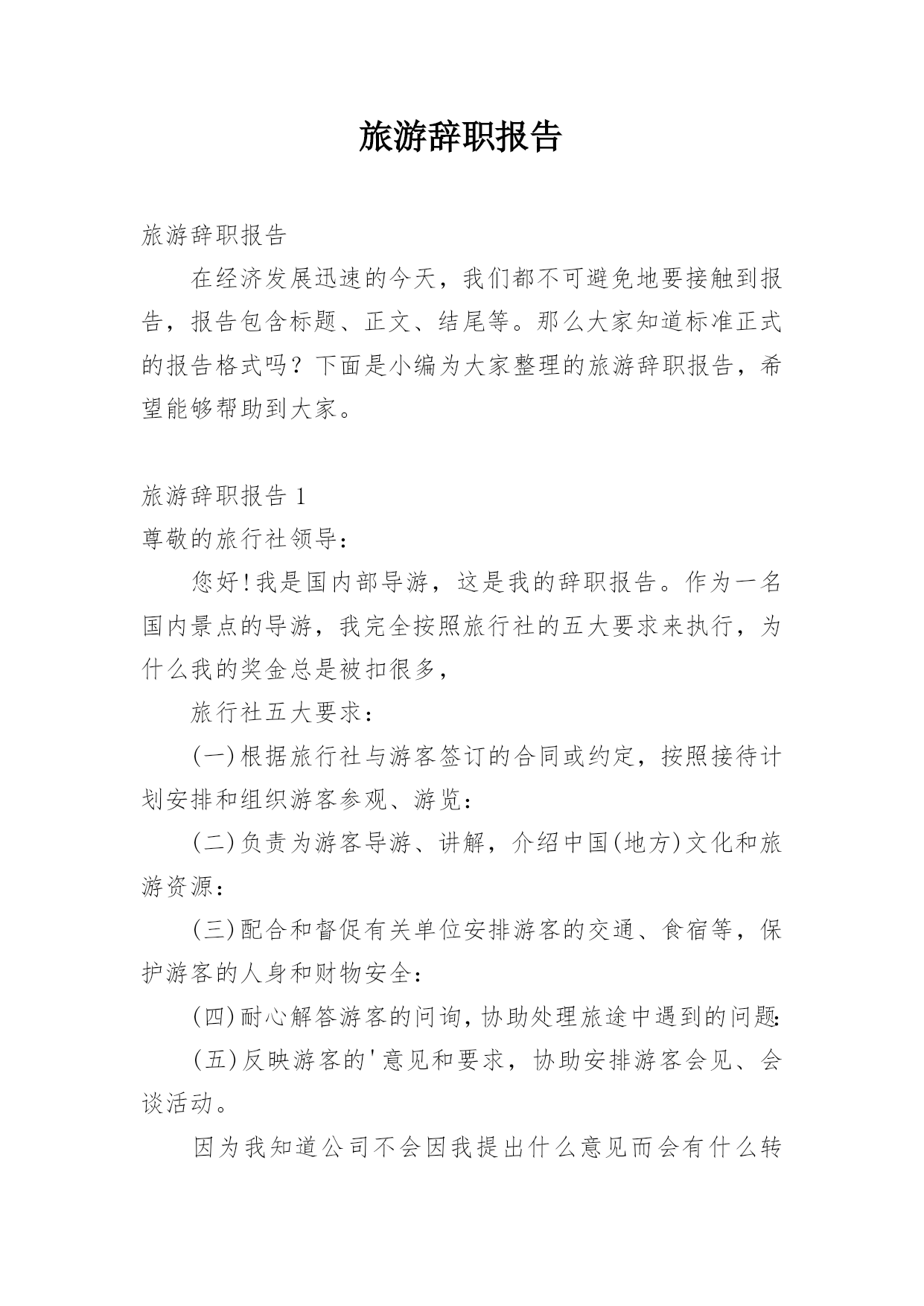 旅游辞职报告旅游辞职报告在经济发展迅速的今天,我们都不可避免地要接触到报告,报告包含标题、正文、结尾等。那么大家知道标准正式的报告格式吗?下面是小编为大家整理的旅游辞职报告,希望能够帮助到大家。旅游辞职报告1尊敬的旅行社领导:您好!我是国内部导游,这是我的辞职报告。作为一名国内景点的导游,我完全按照旅行社的五大要求来执行,为什么我的奖金总是被扣很多,旅行社五大要求:(一)根据旅行社与游客签订的合同或约定,按照接待计划安排和组织游客参观、游览:(二)负责为游客导游、讲解,介绍中国(地方)文化和旅游资源:(三