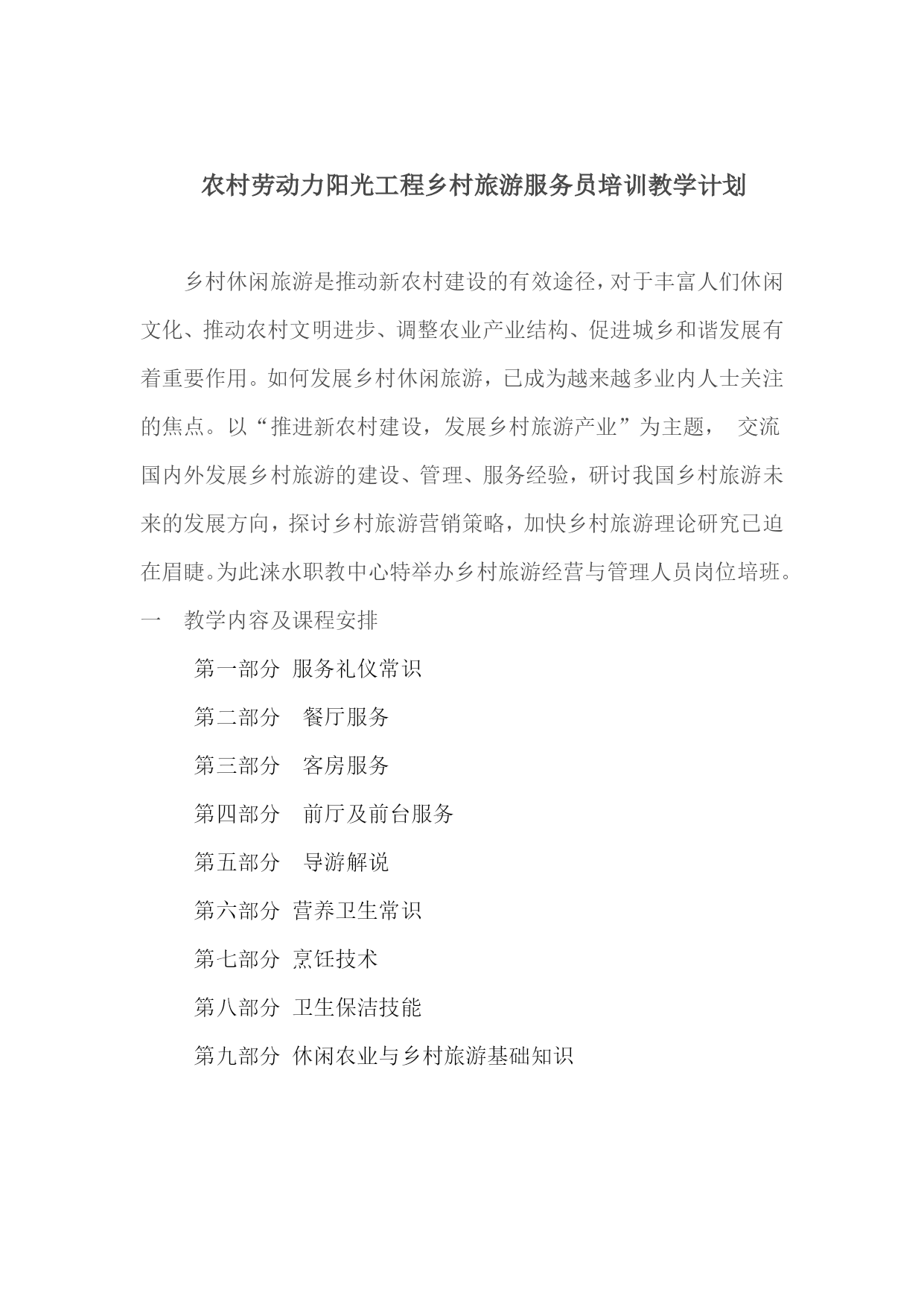 农村劳动力阳光工程乡村旅游服务员培训教学计划乡村休闲旅游是推动新农村建设的有效途径,对于丰富人们休闲文化、推动农村文明进步、调整农业产业结构、促进城乡和谐发展有着重要作用。如何发展乡村休闲旅游,已成为越来越多业内人士关注的焦点。以“推进新农村建设,发展乡村旅游产业”为主题,交流国内外发展乡村旅游的建设、管理、服务经验,研讨我国乡村旅游未来的发展方向,探讨乡村旅游营销策略,加快乡村旅游理论研究已迫在眉睫。为此涞水职教中心特举办乡村旅游经营与管理人员岗位培班。一教学内容及课程安排第一部分服务礼仪常识第二部分餐