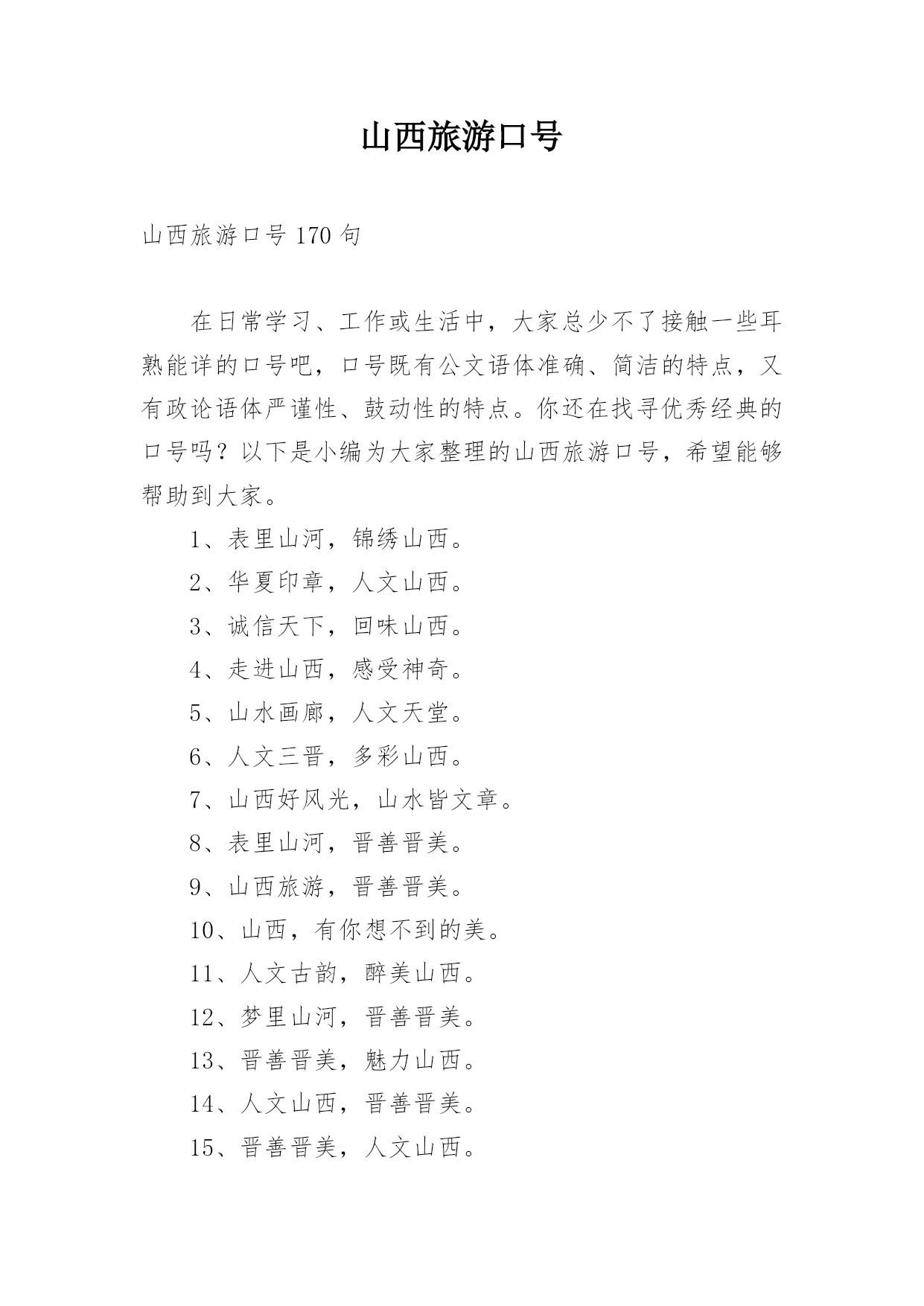山西旅游口号山西旅游口号170句在日常学习、工作或生活中,大家总少不了接触一些耳熟能详的口号吧,口号既有公文语体准确、简洁的特点,又有政论语体严谨性、鼓动性的特点。你还在找寻优秀经典的口号吗?以下是小编为大家整理的山西旅游口号,希望能够帮助到大家。1、表里山河,锦绣山西。2、华夏印章,人文山西。3、诚信天下,回味山西。4、走进山西,感受神奇。5、山水画廊,人文天堂。6、人文三晋,多彩山西。7、山西好风光,山水皆文章。8、表里山河,晋善晋美。9、山西旅游,晋善晋美。10、山西,有你想不到的美。11、人文古韵