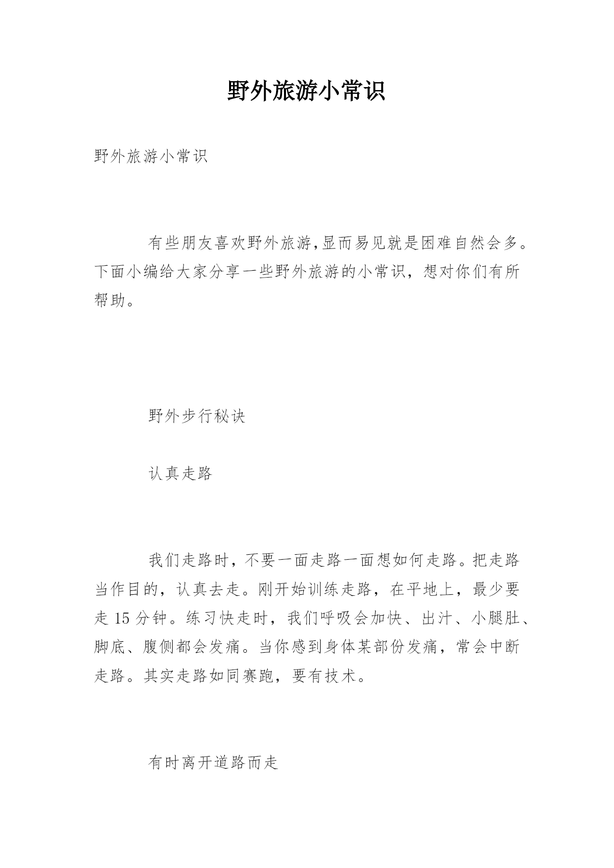 野外旅游小常识野外旅游小常识有些朋友喜欢野外旅游,显而易见就是困难自然会多。下面小编给大家分享一些野外旅游的小常识,想对你们有所帮助。野外步行秘诀认真走路我们走路时,不要一面走路一面想如何走路。把走路当作目的,认真去走。刚开始训练走路,在平地上,最少要走15分钟。练习快走时,我们呼吸会加快、出汁、小腿肚、脚底、腹侧都会发痛。当你感到身体某部份发痛,常会中断走路。其实走路如同赛跑,要有技术。有时离开道路而走发痛的原因有很多,可能因为鞋子、袜子、走路方法所引起。我们在后面会告诉各位走路的要领。走路是一项很好的