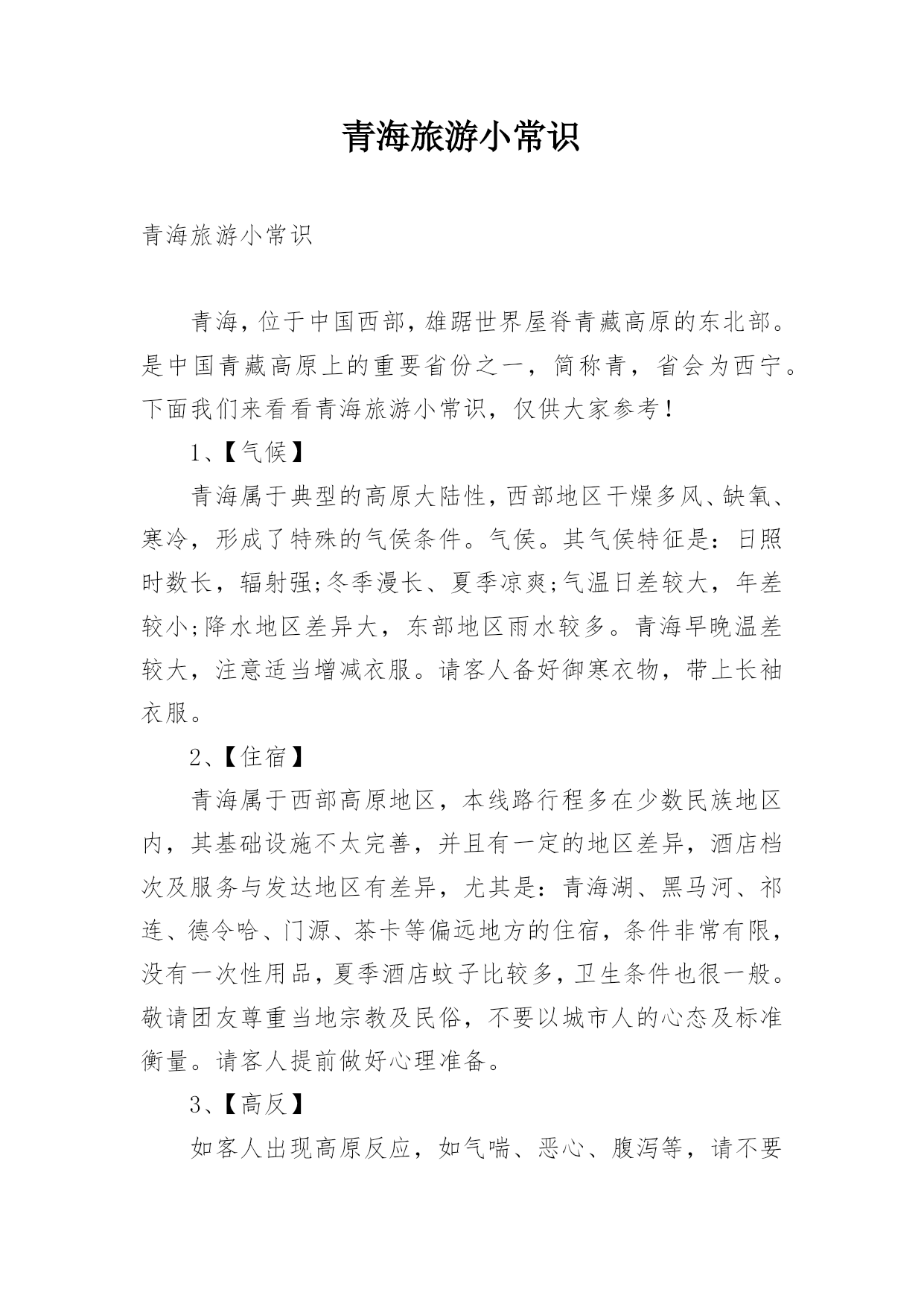 青海旅游小常识青海旅游小常识青海,位于中国西部,雄踞世界屋脊青藏高原的东北部。是中国青藏高原上的重要省份之一,简称青,省会为西宁。下面我们来看看青海旅游小常识,仅供大家参考!1、【气候】青海属于典型的高原大陆性,西部地区干燥多风、缺氧、寒冷,形成了特殊的气侯条件。气侯。其气侯特征是:日照时数长,辐射强;冬季漫长、夏季凉爽;气温日差较大,年差较小;降水地区差异大,东部地区雨水较多。青海早晚温差较大,注意适当增减衣服。请客人备好御寒衣物,带上长袖衣服。2、【住宿】青海属于西部高原地区,本线路行程多在少数民族地