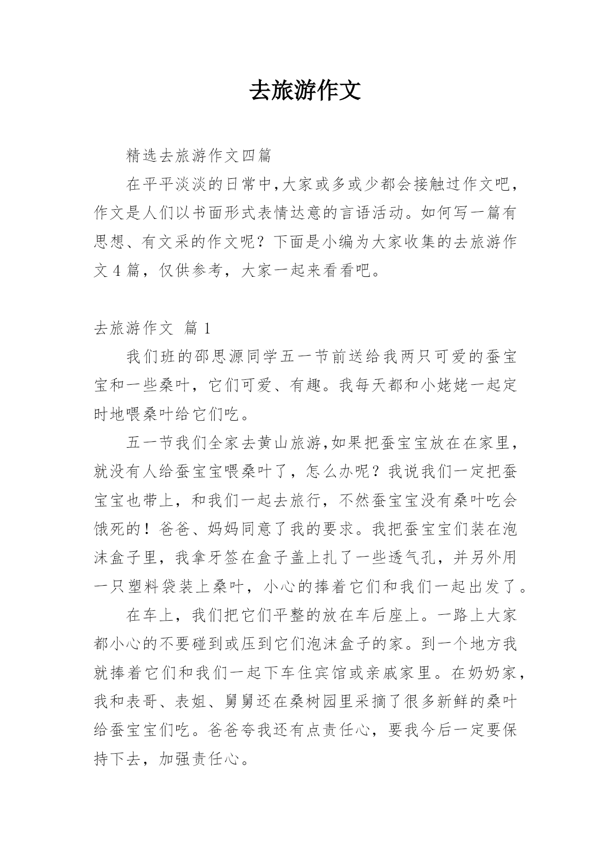 去旅游作文精选去旅游作文四篇在平平淡淡的日常中,大家或多或少都会接触过作文吧,作文是人们以书面形式表情达意的言语活动。如何写一篇有思想、有文采的作文呢?下面是小编为大家收集的去旅游作文4篇,仅供参考,大家一起来看看吧。去旅游作文篇1我们班的邵思源同学五一节前送给我两只可爱的蚕宝宝和一些桑叶,它们可爱、有趣。我每天都和小姥姥一起定时地喂桑叶给它们吃。五一节我们全家去黄山旅游,如果把蚕宝宝放在在家里,就没有人给蚕宝宝喂桑叶了,怎么办呢?我说我们一定把蚕宝宝也带上,和我们一起去旅行,不然蚕宝宝没有桑叶吃会饿死的