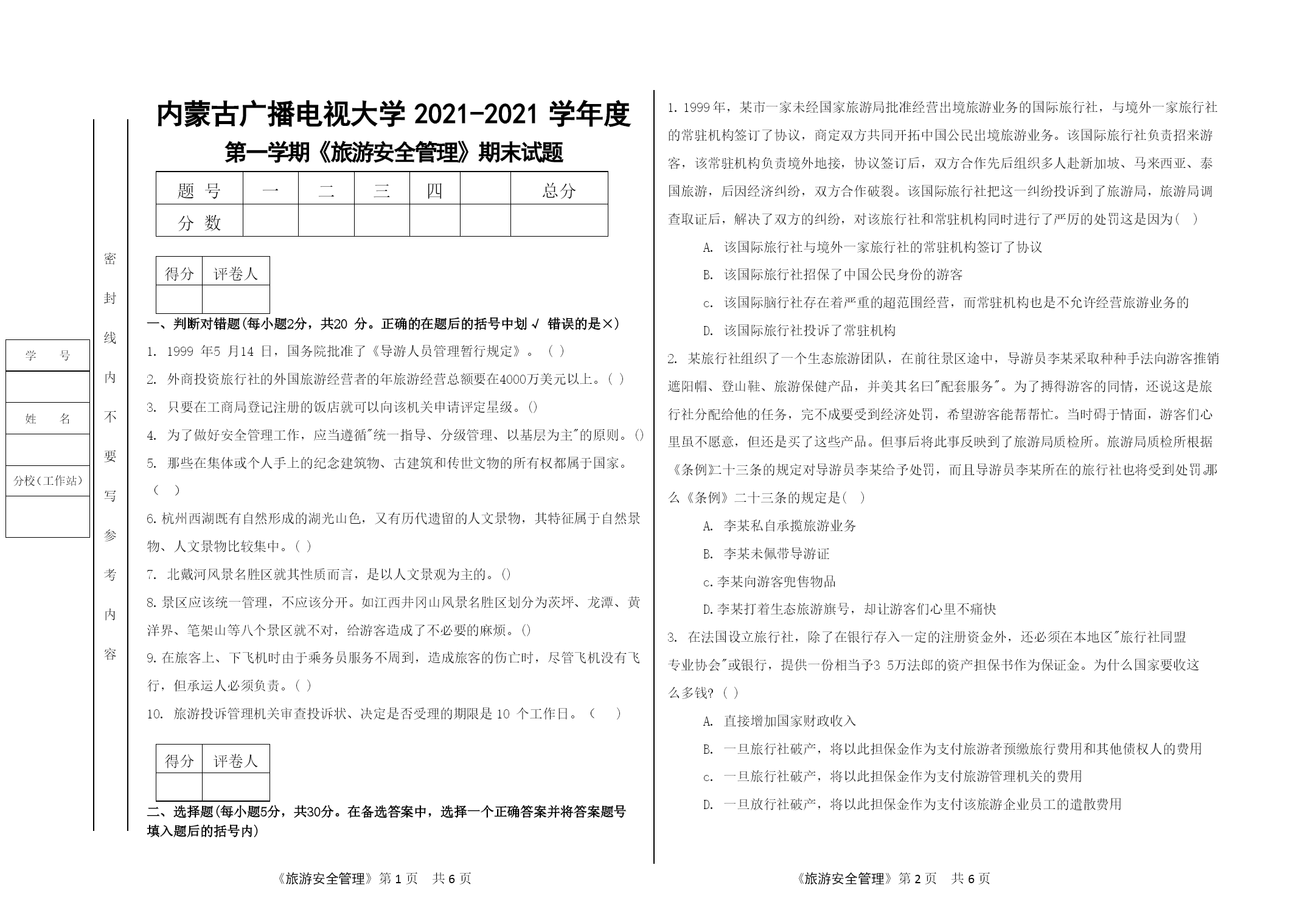 密封线内不要写参考内容学号姓名分校(工作站)内蒙古广播电视大学2021-2021学年度第一学期《旅游安全管理》期末试题题号一二三四总分分数得分评卷人一、判断对错题(每小题2分,共20分。正确的在题后的括号中划√错误的是×)1.1999年5月14日,国务院批准了《导游人员管理暂行规定》。()2.外商投资旅行社的外国旅游经营者的年旅游经营总额要在4000万美元以上。()3.只要在工商局登记注册的饭店就可以向该机关申请评定星级。()4.为了做好安全管理工作,应当遵循"统一指导、分级管理、以基层为主"的原则。()