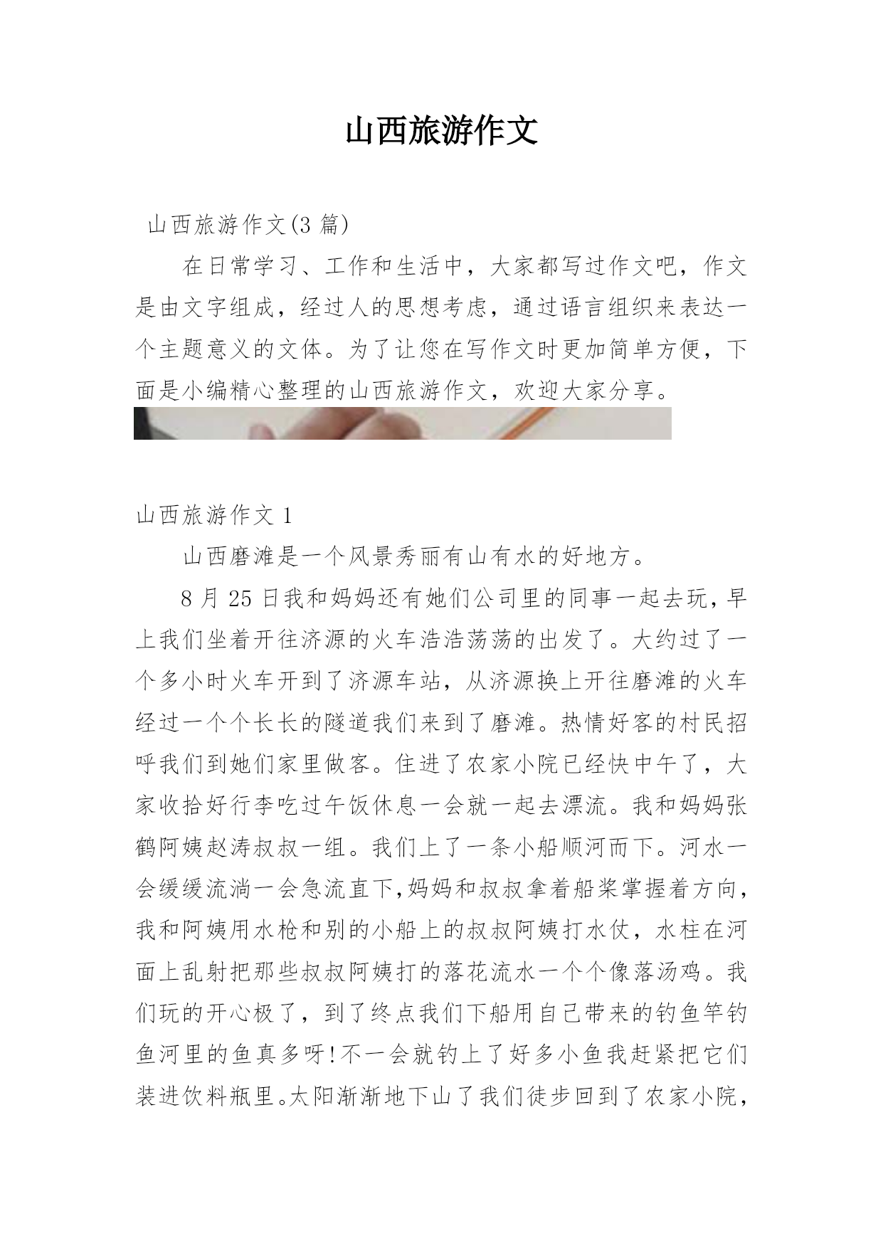 山西旅游作文山西旅游作文(3篇)在日常学习、工作和生活中,大家都写过作文吧,作文是由文字组成,经过人的思想考虑,通过语言组织来表达一个主题意义的文体。为了让您在写作文时更加简单方便,下面是小编精心整理的山西旅游作文,欢迎大家分享。山西旅游作文1山西磨滩是一个风景秀丽有山有水的好地方。8月25日我和妈妈还有她们公司里的同事一起去玩,早上我们坐着开往济源的火车浩浩荡荡的出发了。大约过了一个多小时火车开到了济源车站,从济源换上开往磨滩的火车经过一个个长长的隧道我们来到了磨滩。热情好客的村民招呼我们到她们家里做客