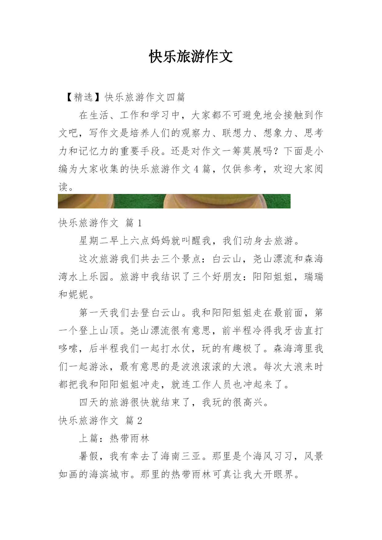 快乐旅游作文【精选】快乐旅游作文四篇在生活、工作和学习中,大家都不可避免地会接触到作文吧,写作文是培养人们的观察力、联想力、想象力、思考力和记忆力的重要手段。还是对作文一筹莫展吗?下面是小编为大家收集的快乐旅游作文4篇,仅供参考,欢迎大家阅读。快乐旅游作文篇1星期二早上六点妈妈就叫醒我,我们动身去旅游。这次旅游我们共去三个景点:白云山,尧山漂流和森海湾水上乐园。旅游中我结识了三个好朋友:阳阳姐姐,瑞瑞和妮妮。第一天我们去登白云山。我和阳阳姐姐走在最前面,第一个登上山顶。尧山漂流很有意思,前半程冷得我牙齿直