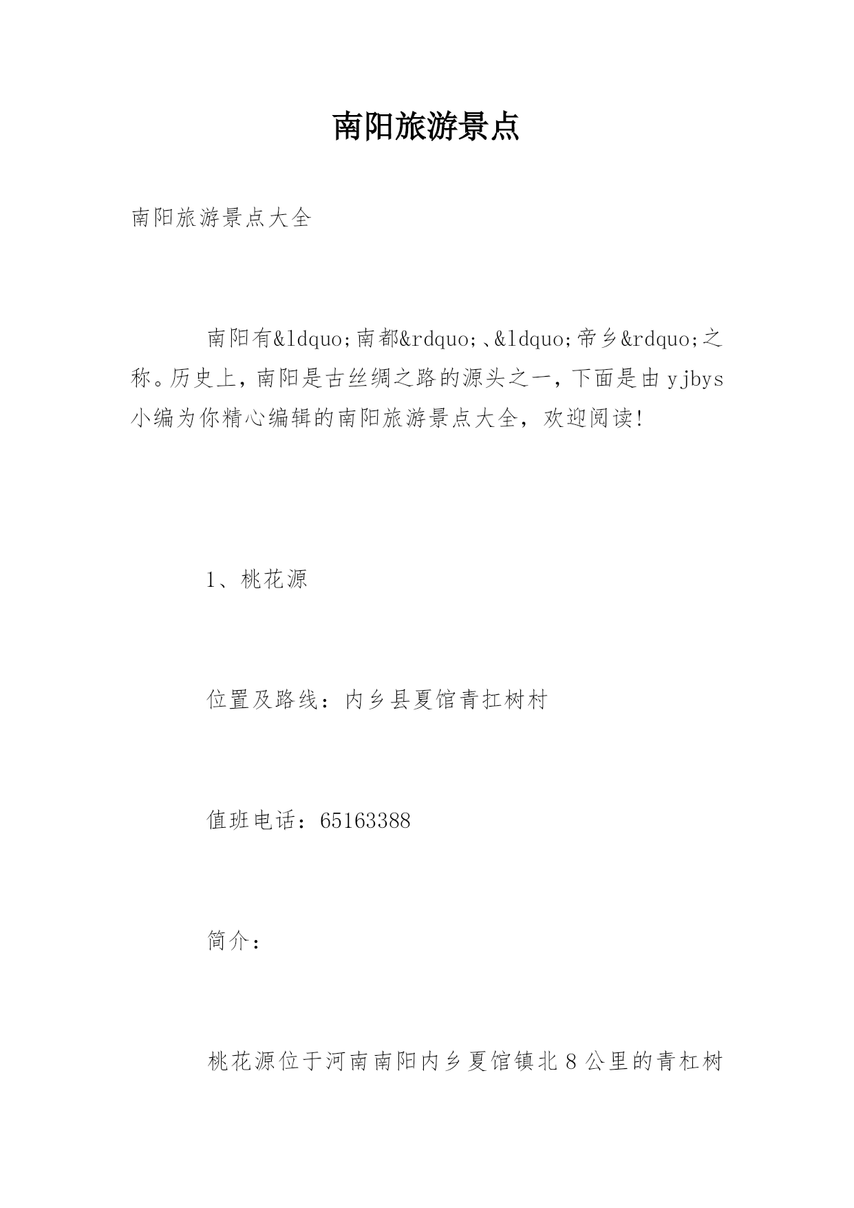 南阳旅游景点南阳旅游景点大全南阳有“南都”、“帝乡”之称。历史上,南阳是古丝绸之路的源头之一,下面是由yjbys小编为你精心编辑的南阳旅游景点大全,欢迎阅读!1、桃花源位置及路线:内乡县夏馆青扛树村值班电话:65163388简介:桃花源位于河南南阳内乡夏馆镇北8公里的青杠树村,属于世界地质公园宝天曼自然保护区内的一个优秀景点。据说是陶渊明的‘桃花源记’中的桃花源所在地。2、云露山位置及路线:内乡县马山口镇石庙村值班电话:6021555