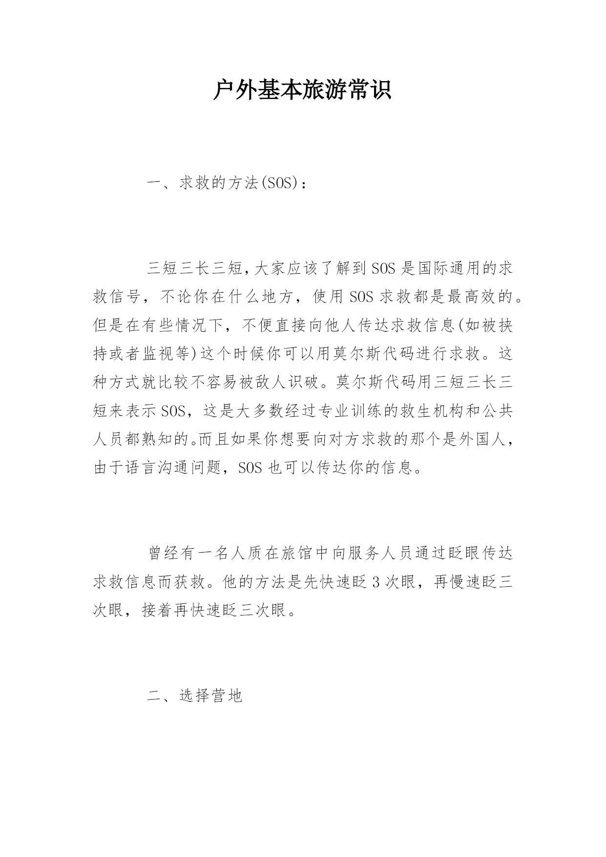 户外基本旅游常识一、求救的方法(SOS):三短三长三短,大家应该了解到SOS是国际通用的求救信号,不论你在什么地方,使用SOS求救都是最高效的。但是在有些情况下,不便直接向他人传达求救信息(如被挟持或者监视等)这个时候你可以用莫尔斯代码进行求救。这种方式就比较不容易被敌人识破。莫尔斯代码用三短三长三短来表示SOS,这是大多数经过专业训练的救生机构和公共人员都熟知的。而且如果你想要向对方求救的那个是外国人,由于语言沟通问题,SOS也可以传达你的信息。曾经有一名人质在旅馆中向服务人员通过眨眼传达求救信息而获救