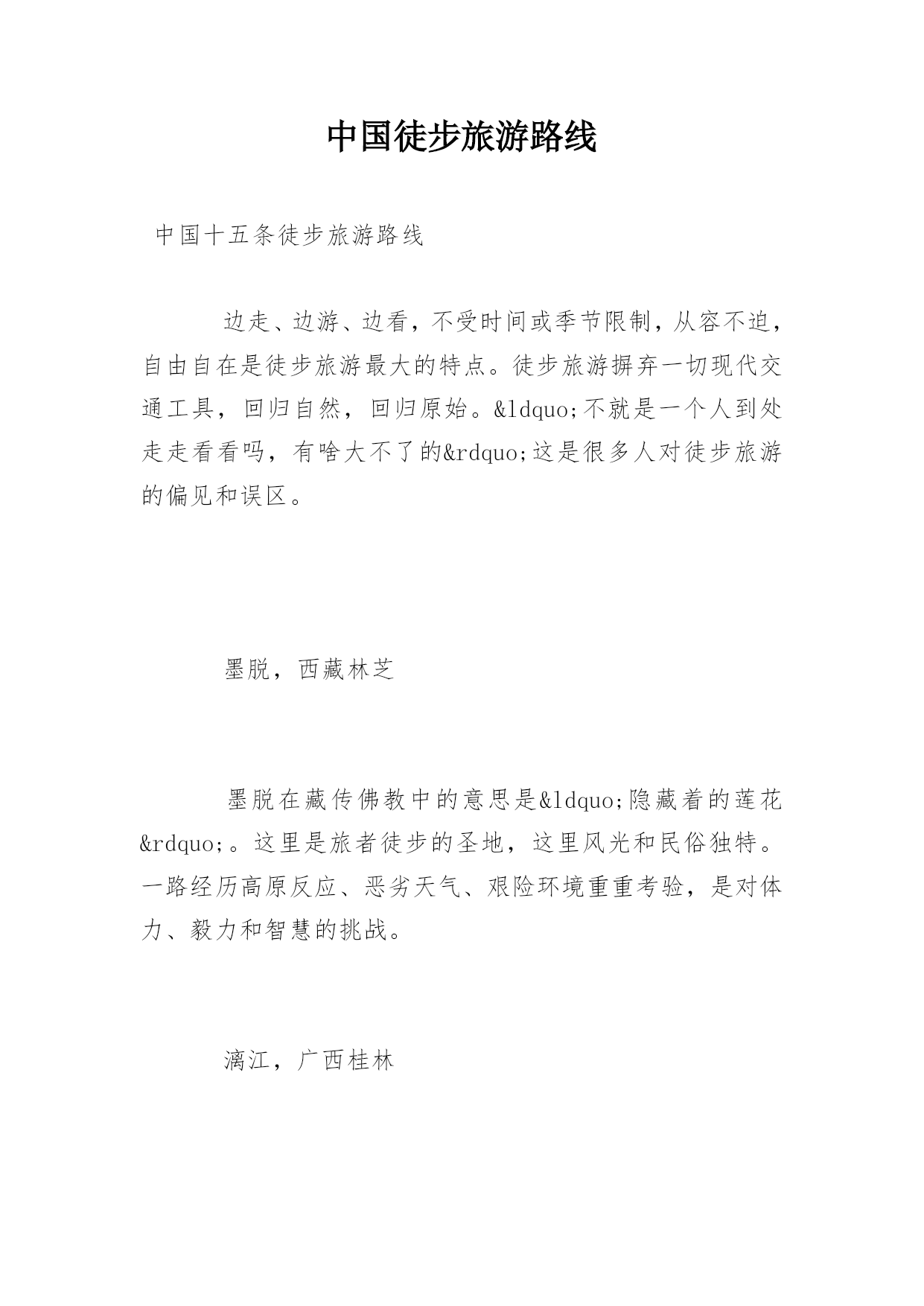 中国徒步旅游路线中国十五条徒步旅游路线边走、边游、边看,不受时间或季节限制,从容不迫,自由自在是徒步旅游最大的特点。徒步旅游摒弃一切现代交通工具,回归自然,回归原始。“不就是一个人到处走走看看吗,有啥大不了的”这是很多人对徒步旅游的偏见和误区。墨脱,西藏林芝墨脱在藏传佛教中的意思是“隐藏着的莲花”。这里是旅者徒步的圣地,这里风光和民俗独特。一路经历高原反应、恶劣天气、艰险环境重重考验,是对体力、毅力和智慧的挑战。漓江,广西桂林都说“桂林山水甲天下