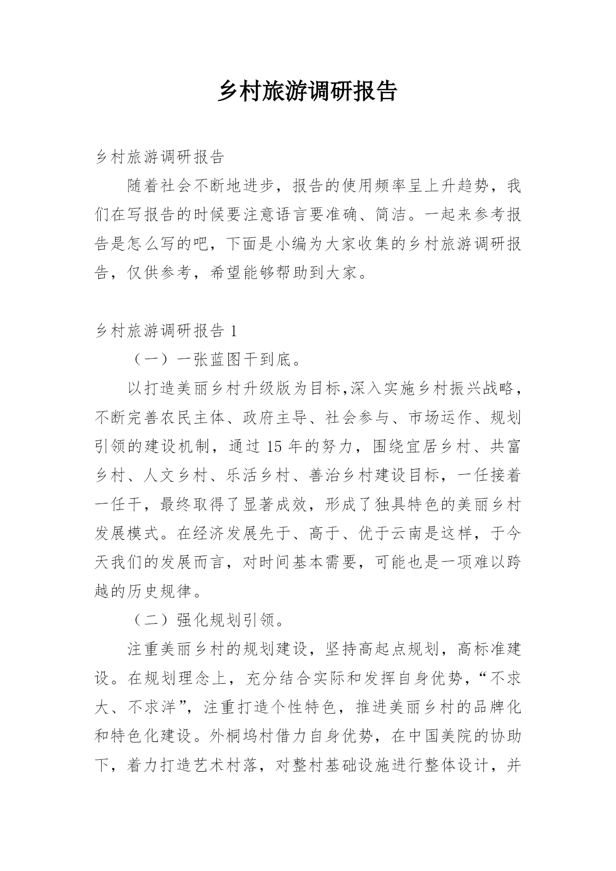 乡村旅游调研报告乡村旅游调研报告随着社会不断地进步,报告的使用频率呈上升趋势,我们在写报告的时候要注意语言要准确、简洁。一起来参考报告是怎么写的吧,下面是小编为大家收集的乡村旅游调研报告,仅供参考,希望能够帮助到大家。乡村旅游调研报告1(一)一张蓝图干到底。以打造美丽乡村升级版为目标,深入实施乡村振兴战略,不断完善农民主体、政府主导、社会参与、市场运作、规划引领的建设机制,通过15年的努力,围绕宜居乡村、共富乡村、人文乡村、乐活乡村、善治乡村建设目标,一任接着一任干,最终取得了显著成效,形成了独具特色的美