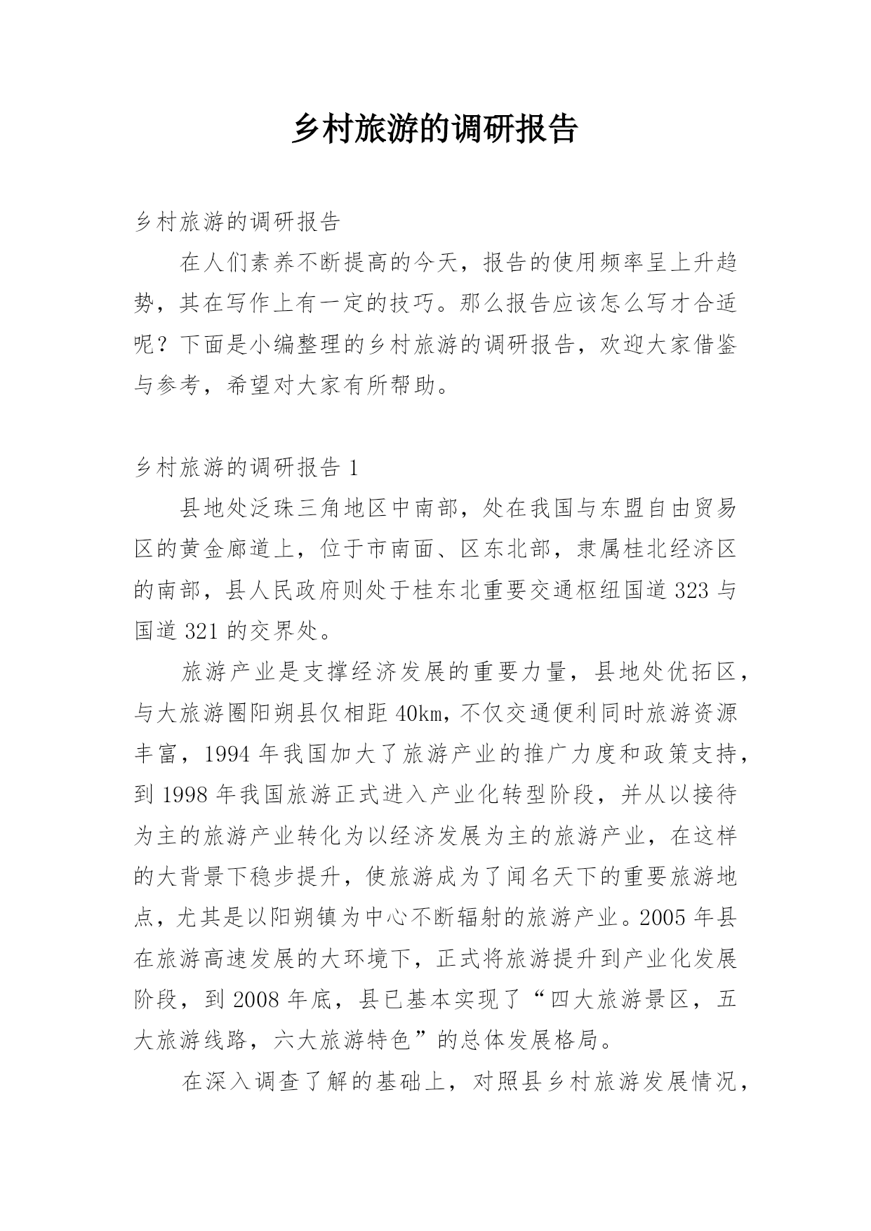 乡村旅游的调研报告乡村旅游的调研报告在人们素养不断提高的今天,报告的使用频率呈上升趋势,其在写作上有一定的技巧。那么报告应该怎么写才合适呢?下面是小编整理的乡村旅游的调研报告,欢迎大家借鉴与参考,希望对大家有所帮助。乡村旅游的调研报告1县地处泛珠三角地区中南部,处在我国与东盟自由贸易区的黄金廊道上,位于市南面、区东北部,隶属桂北经济区的南部,县人民政府则处于桂东北重要交通枢纽国道323与国道321的交界处。旅游产业是支撑经济发展的重要力量,县地处优拓区,与大旅游圈阳朔县仅相距40km,不仅交通便利同时旅游