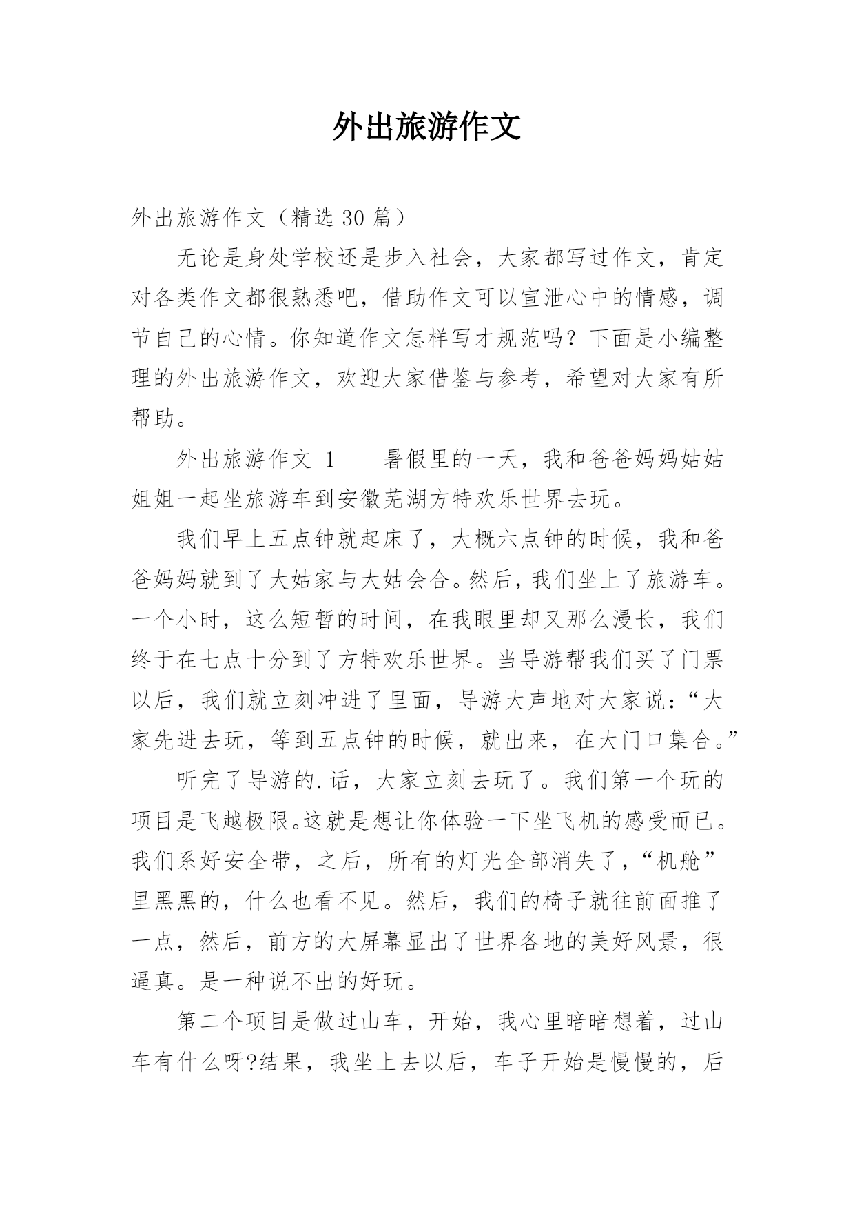 外出旅游作文外出旅游作文(精选30篇)无论是身处学校还是步入社会,大家都写过作文,肯定对各类作文都很熟悉吧,借助作文可以宣泄心中的情感,调节自己的心情。你知道作文怎样写才规范吗?下面是小编整理的外出旅游作文,欢迎大家借鉴与参考,希望对大家有所帮助。外出旅游作文1暑假里的一天,我和爸爸妈妈姑姑姐姐一起坐旅游车到安徽芜湖方特欢乐世界去玩。我们早上五点钟就起床了,大概六点钟的时候,我和爸爸妈妈就到了大姑家与大姑会合。然后,我们坐上了旅游车。一个小时,这么短暂的时间,在我眼里却又那么漫长,我们终于在七点十分到了方