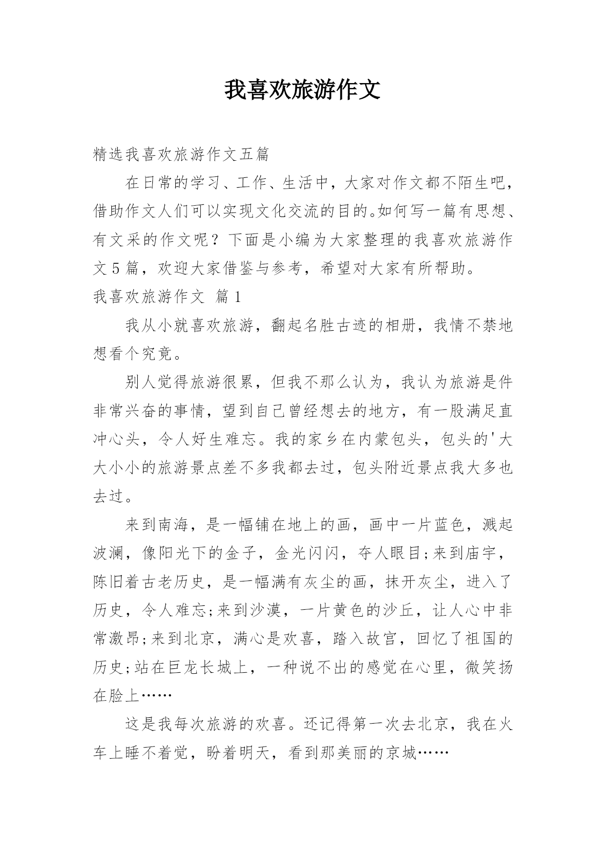 我喜欢旅游作文精选我喜欢旅游作文五篇在日常的学习、工作、生活中,大家对作文都不陌生吧,借助作文人们可以实现文化交流的目的。如何写一篇有思想、有文采的作文呢?下面是小编为大家整理的我喜欢旅游作文5篇,欢迎大家借鉴与参考,希望对大家有所帮助。我喜欢旅游作文篇1我从小就喜欢旅游,翻起名胜古迹的相册,我情不禁地想看个究竟。别人觉得旅游很累,但我不那么认为,我认为旅游是件非常兴奋的事情,望到自己曾经想去的地方,有一股满足直冲心头,令人好生难忘。我的家乡在内蒙包头,包头的'大大小小的旅游景点差不多我都去过,包头附近景