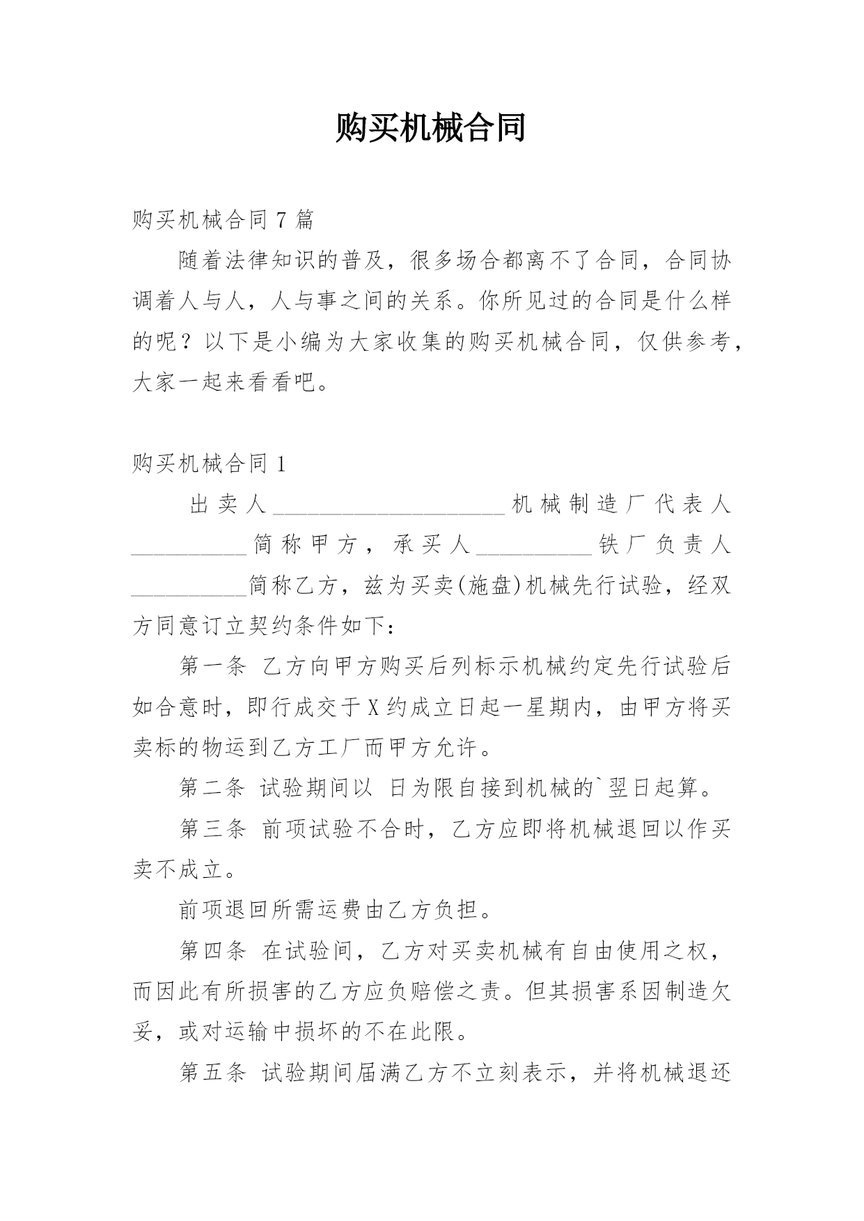 购买机械合同购买机械合同7篇随着法律知识的普及,很多场合都离不了合同,合同协调着人与人,人与事之间的关系。你所见过的合同是什么样的呢?以下是小编为大家收集的购买机械合同,仅供参考,大家一起来看看吧。购买机械合同1出卖人____________________机械制造厂代表人__________简称甲方,承买人__________铁厂负责人__________简称乙方,兹为买卖(施盘)机械先行试验,经双方同意订立契约条件如下:第一条乙方向甲方购买后列标示机械约定先行试验后如合意时,即行成交于X约成立日起一星