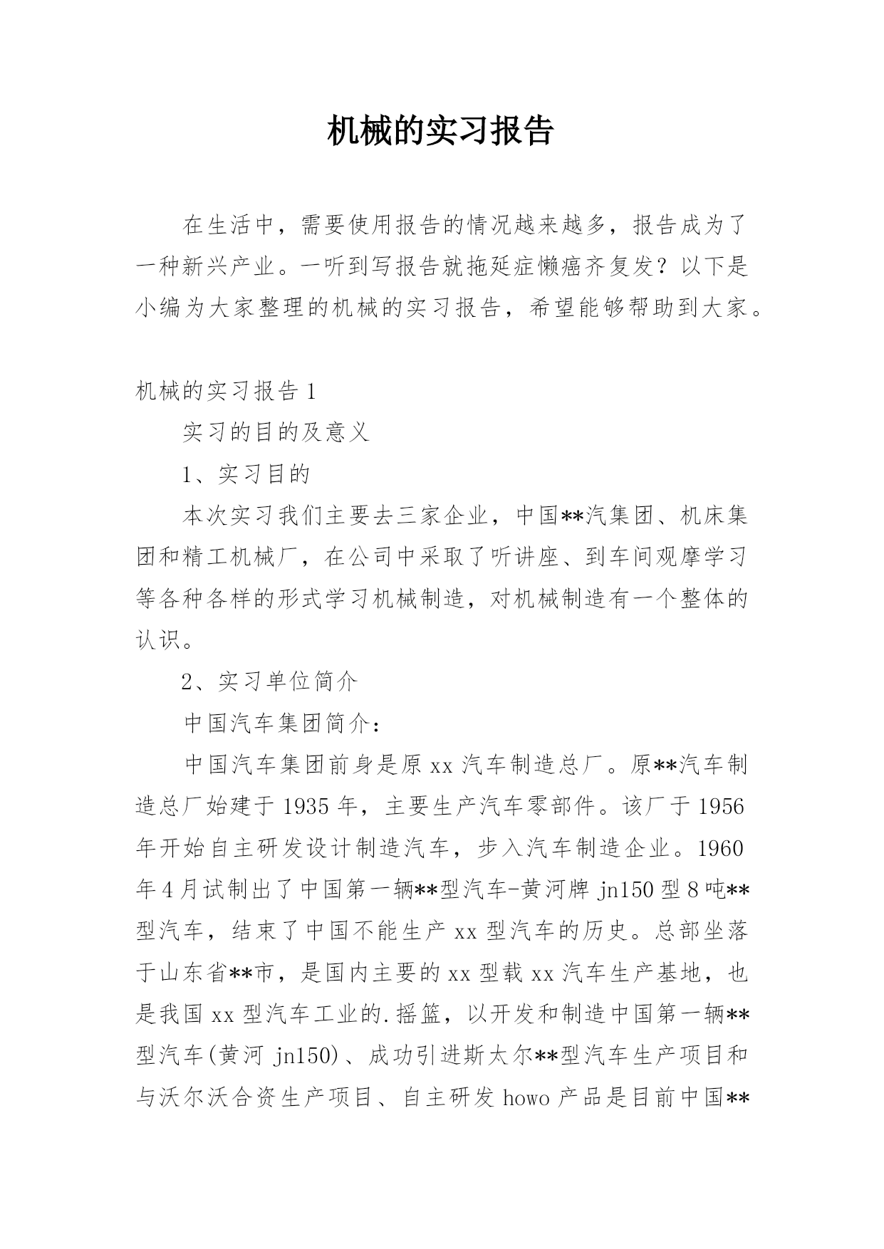 机械的实习报告在生活中,需要使用报告的情况越来越多,报告成为了一种新兴产业。一听到写报告就拖延症懒癌齐复发?以下是小编为大家整理的机械的实习报告,希望能够帮助到大家。机械的实习报告1实习的目的及意义1、实习目的本次实习我们主要去三家企业,中国**汽集团、机床集团和精工机械厂,在公司中采取了听讲座、到车间观摩学习等各种各样的形式学习机械制造,对机械制造有一个整体的认识。2、实习单位简介中国汽车集团简介:中国汽车集团前身是原xx汽车制造总厂。原**汽车制造总厂始建于1935年,主要生产汽车零部件。该厂于195