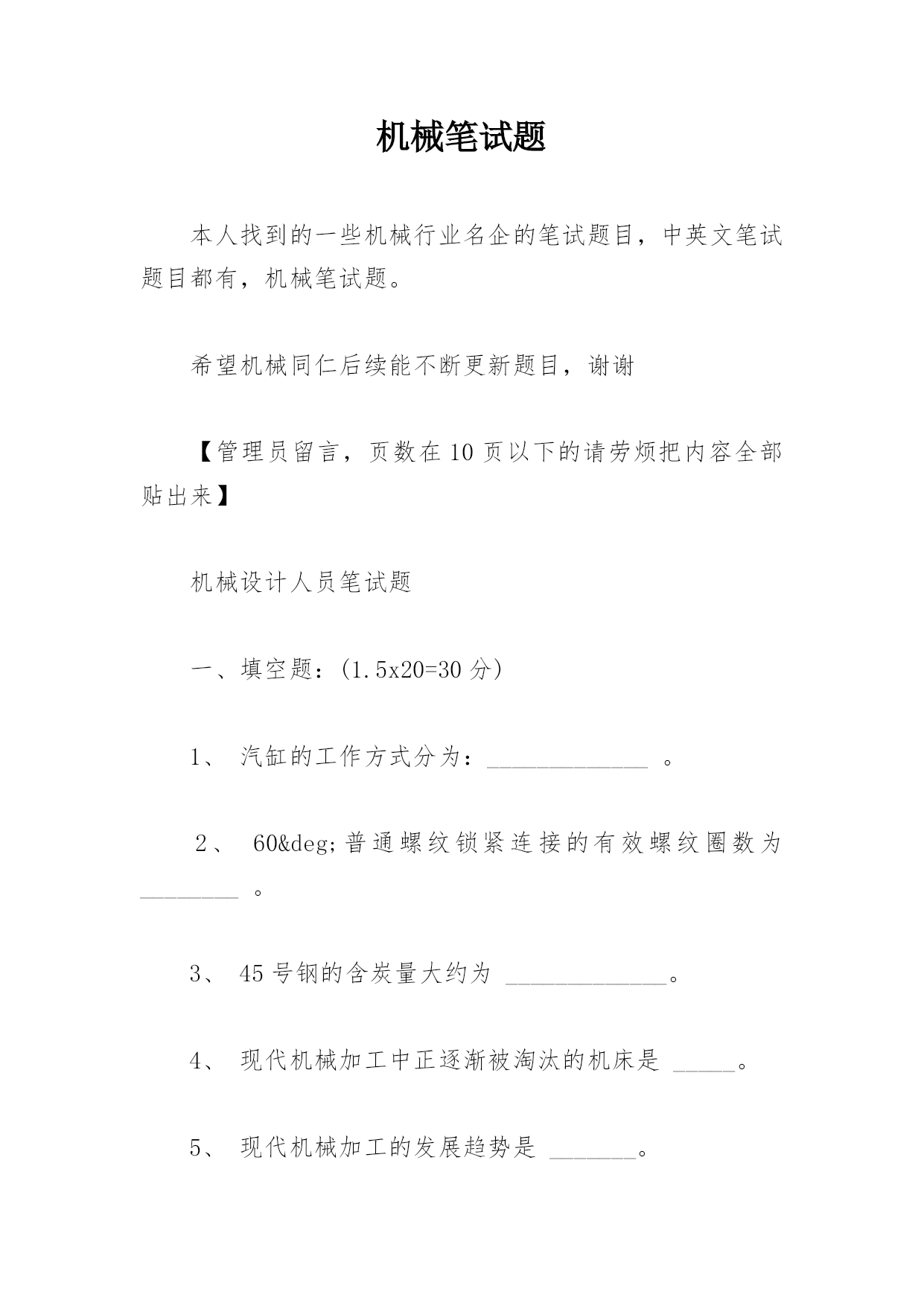 机械笔试题本人找到的一些机械行业名企的笔试题目,中英文笔试题目都有,机械笔试题。希望机械同仁后续能不断更新题目,谢谢【管理员留言,页数在10页以下的请劳烦把内容全部贴出来】机械设计人员笔试题一、填空题:(1.5x20=30分)1、汽缸的工作方式分为:_____________。2、60°普通螺纹锁紧连接的有效螺纹圈数为________。3、45号钢的含炭量大约为_____________。4、现代机械加工中正逐渐被淘汰的机床是_____。5、现代机械加工的发展趋势是_______。6、EDM的中文