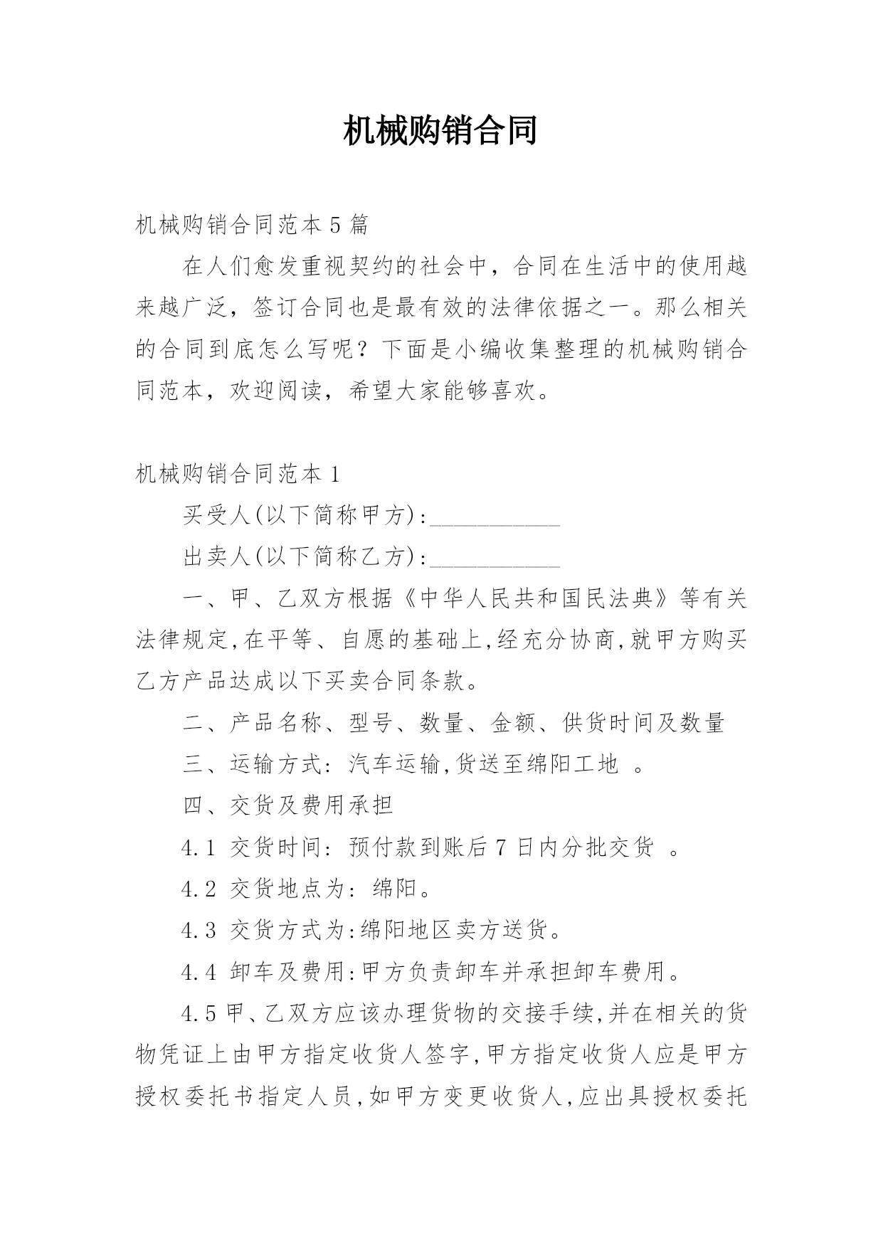 机械购销合同机械购销合同范本5篇在人们愈发重视契约的社会中,合同在生活中的使用越来越广泛,签订合同也是最有效的法律依据之一。那么相关的合同到底怎么写呢?下面是小编收集整理的机械购销合同范本,欢迎阅读,希望大家能够喜欢。机械购销合同范本1买受人(以下简称甲方):___________出卖人(以下简称乙方):___________一、甲、乙双方根据《中华人民共和国民法典》等有关法律规定,在平等、自愿的基础上,经充分协商,就甲方购买乙方产品达成以下买卖合同条款。二、产品名称、型号、数量、金额、供货时间及数量三、
