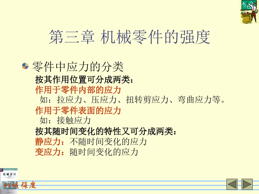 第三章机械零件的强度变应力又可分为:随机变应力:应力随机变化最小应力与最大应力之比,称为应力循环特性系数。用r表示称为脉动循环变应力。机械零件工作时,因受外界的影响,其所受的应力很少是静止不变的。在设计时对于零件破坏时应力变化次数少于103的变应力,近似地按静应力进行计算或校核。变应力时机械零件的强度计算疲劳曲线不同循环特性下,材料所能承受的最大应力与其循环次数的关系可以用疲劳曲线来表示。称为σ-N曲线。将疲劳曲线的两个坐标取对数,可以将原曲线转化为双对数坐标的疲劳曲线。推导,上式可写成下面的形式例题:4