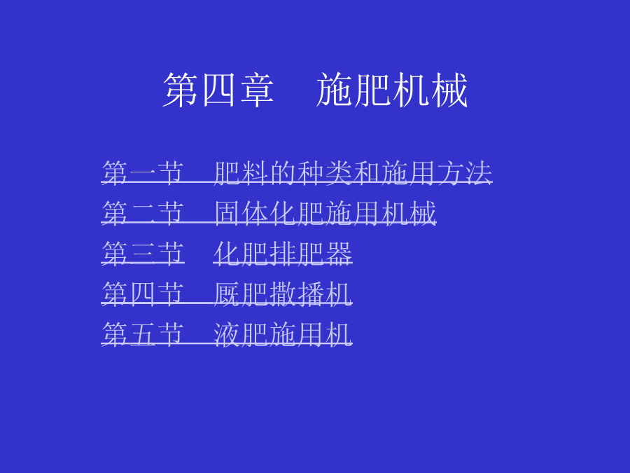 第一节肥料的种类和施用方法第二节固体化肥施用机械第三节化肥排肥器第四节厩肥撒播机第五节液肥施用机第一节肥料的种类和施用方法化学肥料只含有一种或两、三种营养元素,但含量高,肥效快,用量少。半个世纪以来,化肥对于保证农作物产量的不断增长,在全世界都起着不可低估的作用。化学肥料是由工厂生产商品肥料,一般加工成颗粒状、结晶状或粉状,装袋出售。液态化肥主要是由液氨和氨水。液氨含氮量高,约82%,氨水则是氨的水溶液,含氮量仅15-20%。但由于长期大量施用化学肥料,造成土壤某些营养成分严重缺乏,氮、磷、钾的比例失调,
