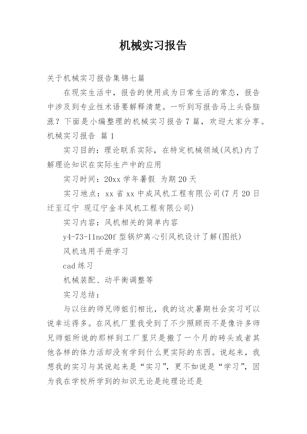 机械实习报告关于机械实习报告集锦七篇在现实生活中,报告的使用成为日常生活的常态,报告中涉及到专业性术语要解释清楚。一听到写报告马上头昏脑涨?下面是小编整理的机械实习报告7篇,欢迎大家分享。机械实习报告篇1实习目的:理论联系实际,在特定机械领域(风机)内了解理论知识在实际生产中的应用实习时间:20xx学年暑假为期20天实习地点:xx省xx中成风机工程有限公司(7月20日迁至辽宁现辽宁金丰风机工程有限公司)实习内容:风机相关的简单内容y4-73-11no20f型锅炉离心引风机设计了解(图纸)风机选用手册学习c