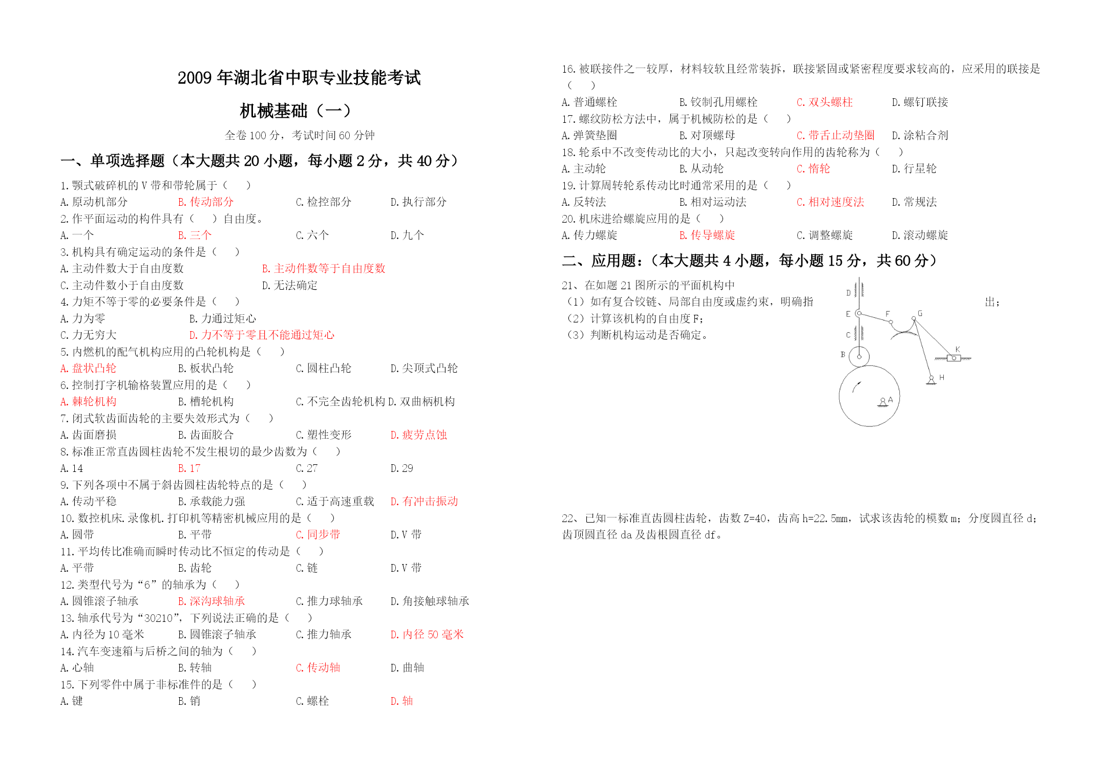 2009年湖北省中职专业技能考试机械基础(一)全卷100分,考试时间60分钟一、单项选择题(本大题共20小题,每小题2分,共40分)1.颚式破碎机的V带和带轮属于()A.原动机部分B.传动部分C.检控部分D.执行部分2.作平面运动的构件具有()自由度。A.一个B.三个C.六个D.九个3.机构具有确定运动的条件是()A.主动件数大于自由度数B.主动件数等于自由度数C.主动件数小于自由度数D.无法确定4.力矩不等于零的必要条件是()A.力为零B.力通过矩心C.力无穷大D.力不等于零且不能通过矩心5.内燃机的配