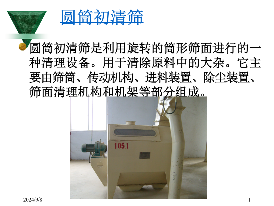 圆筒初清筛圆筒初清筛的工作过程方框图永磁筒的结构磁选设备—永磁筒刮板输送机螺旋输送机斗式提升机斗式提升机旋转分配器料仓饲料粉碎粉碎设备分类锤片式粉碎机配料系统混合设备混合机的结构超微粉碎机调节分级轮的转速和风量的大小可改变成品的粒度,降低分级轮的转速,成品粒度变粗,反之则变细。1.螺旋进料机构2.粉碎式3.分级式4.分流锥套5.粉碎盘图1粉碎机主机结构图刹克龙脉冲除尘器脉冲除尘器工作原理刹克龙通常与脉冲除尘器结合使用以达到集粉除尘的作用高方筛2024/9/8环模制粒机环模制粒机的制粒原理2024/9/8压