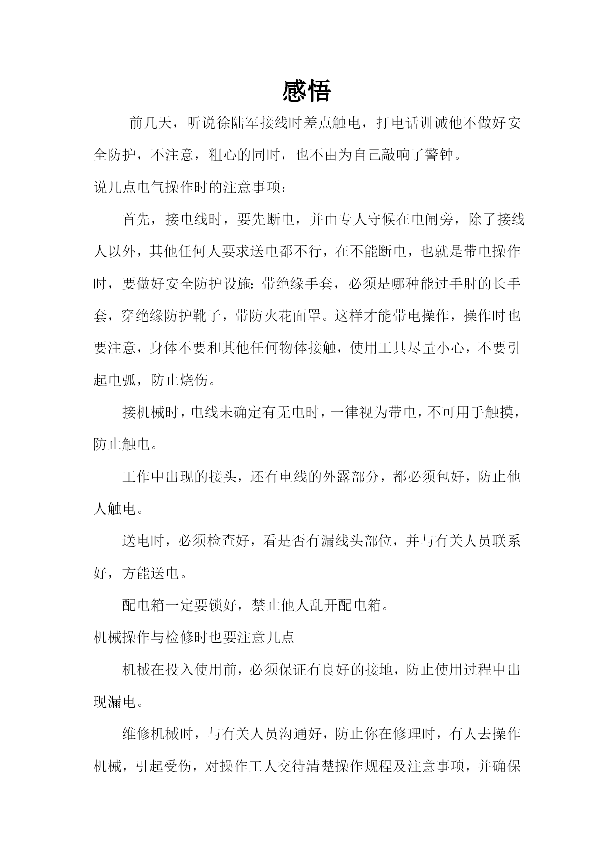感悟前几天,听说徐陆军接线时差点触电,打电话训诫他不做好安全防护,不注意,粗心的同时,也不由为自己敲响了警钟。说几点电气操作时的注意事项:首先,接电线时,要先断电,并由专人守候在电闸旁,除了接线人以外,其他任何人要求送电都不行,在不能断电,也就是带电操作时,要做好安全防护设施:带绝缘手套,必须是哪种能过手肘的长手套,穿绝缘防护靴子,带防火花面罩。这样才能带电操作,操作时也要注意,身体不要和其他任何物体接触,使用工具尽量小心,不要引起电弧,防止烧伤。接机械时,电线未确定有无电时,一律视为带电,不可用手触摸,