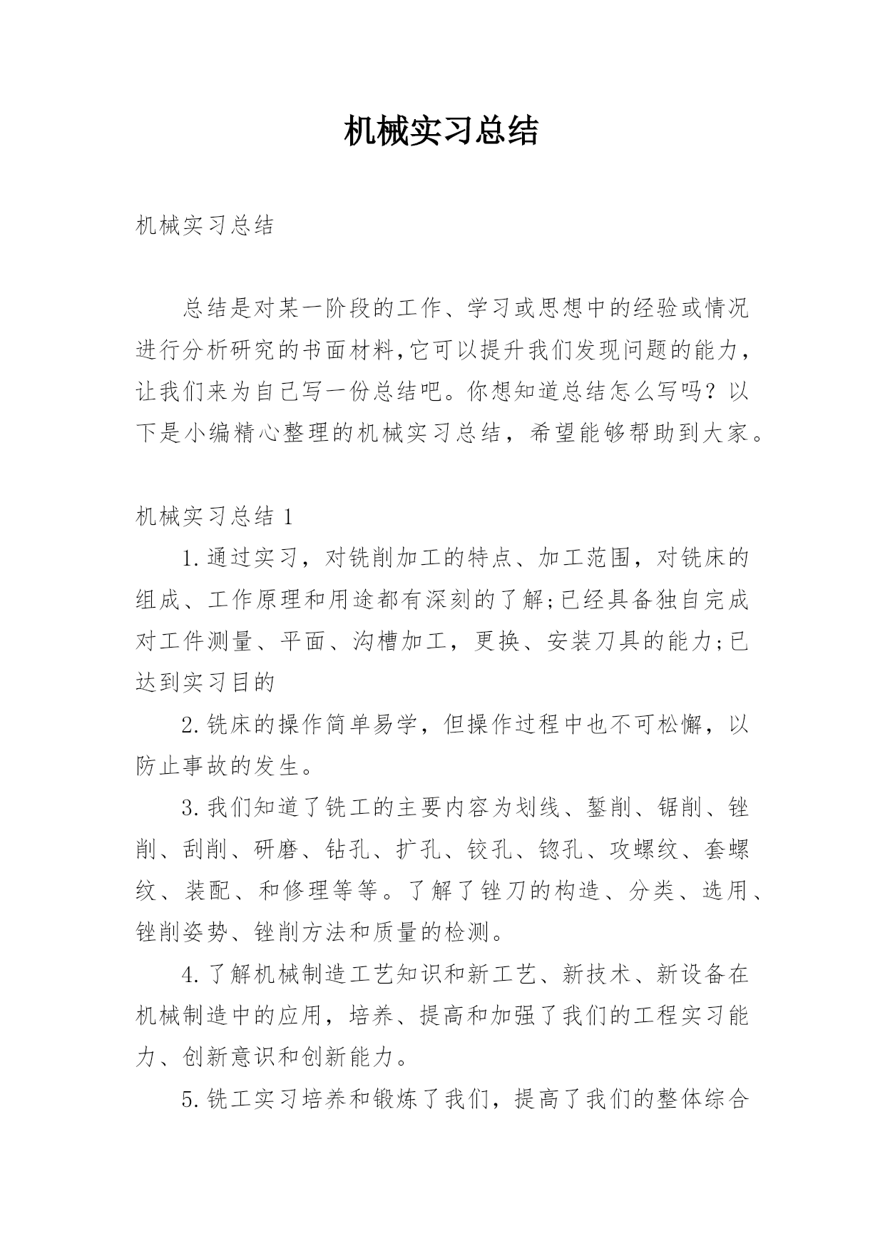 机械实习总结机械实习总结总结是对某一阶段的工作、学习或思想中的经验或情况进行分析研究的书面材料,它可以提升我们发现问题的能力,让我们来为自己写一份总结吧。你想知道总结怎么写吗?以下是小编精心整理的机械实习总结,希望能够帮助到大家。机械实习总结11.通过实习,对铣削加工的特点、加工范围,对铣床的组成、工作原理和用途都有深刻的了解;已经具备独自完成对工件测量、平面、沟槽加工,更换、安装刀具的能力;已达到实习目的2.铣床的操作简单易学,但操作过程中也不可松懈,以防止事故的发生。3.我们知道了铣工的主要内容为划线