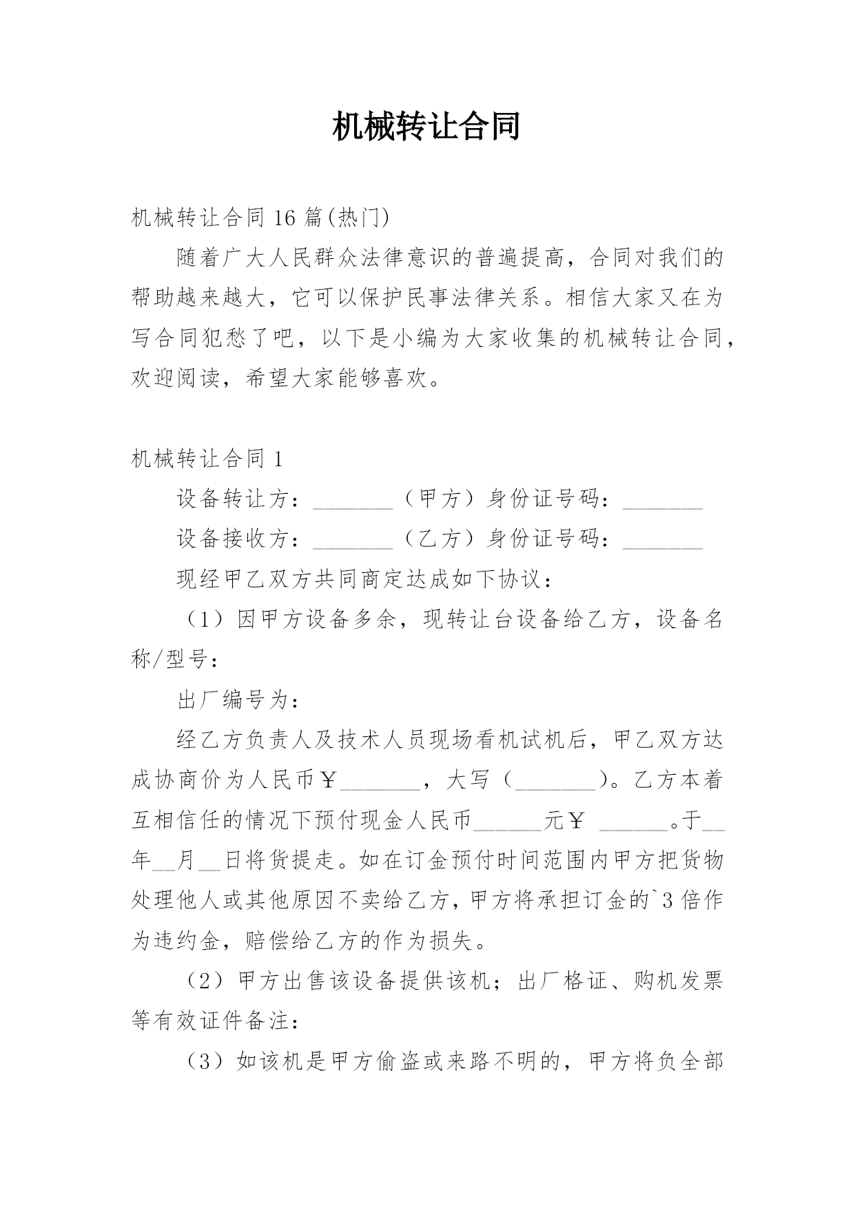 机械转让合同机械转让合同16篇(热门)随着广大人民群众法律意识的普遍提高,合同对我们的帮助越来越大,它可以保护民事法律关系。相信大家又在为写合同犯愁了吧,以下是小编为大家收集的机械转让合同,欢迎阅读,希望大家能够喜欢。机械转让合同1设备转让方:_______(甲方)身份证号码:_______设备接收方:_______(乙方)身份证号码:_______现经甲乙双方共同商定达成如下协议:(1)因甲方设备多余,现转让台设备给乙方,设备名称/型号:出厂编号为:经乙方负责人及技术人员现场看机试机后,甲乙双方达成协商